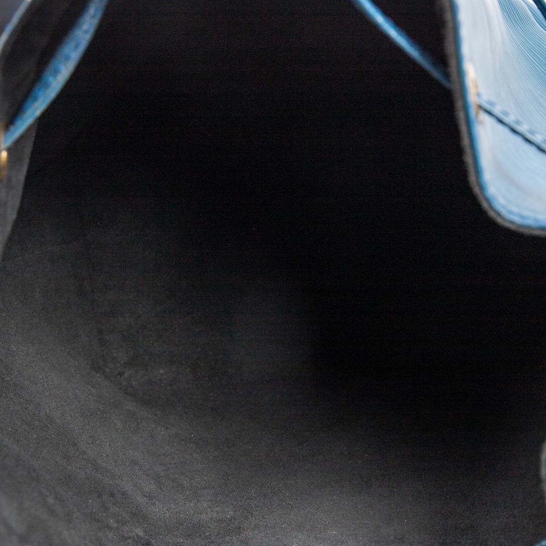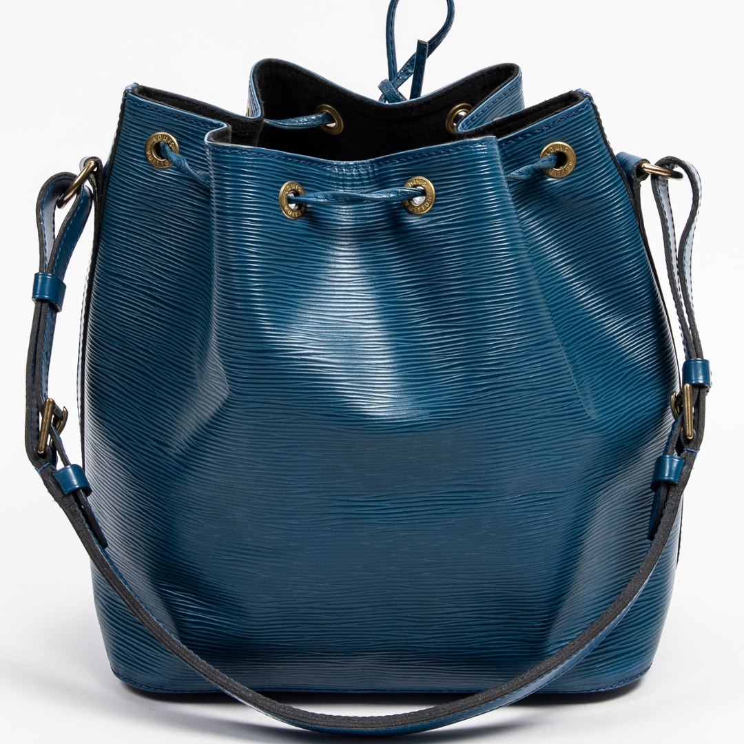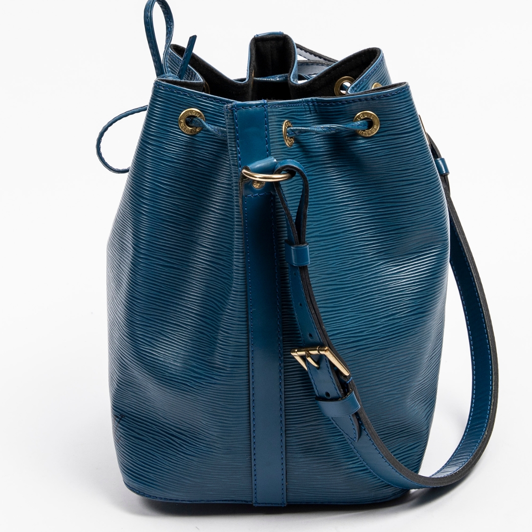 A vintage Louis Vuitton blue calf leather Noe bag with a certificate of authenticity, this striking piece highlights the classic Noe silhouette while offering a rarer and beautifully saturated blue finish. Crafted from Louis Vuitton’s distinctive Epi leather, the exterior showcases the signature textured grain, which adds depth, durability, and a refined sheen to the overall design. The drawstring closure adds a timeless touch, allowing the shape to be adjusted with ease while contributing to the Noe’s characteristic relaxed structure.