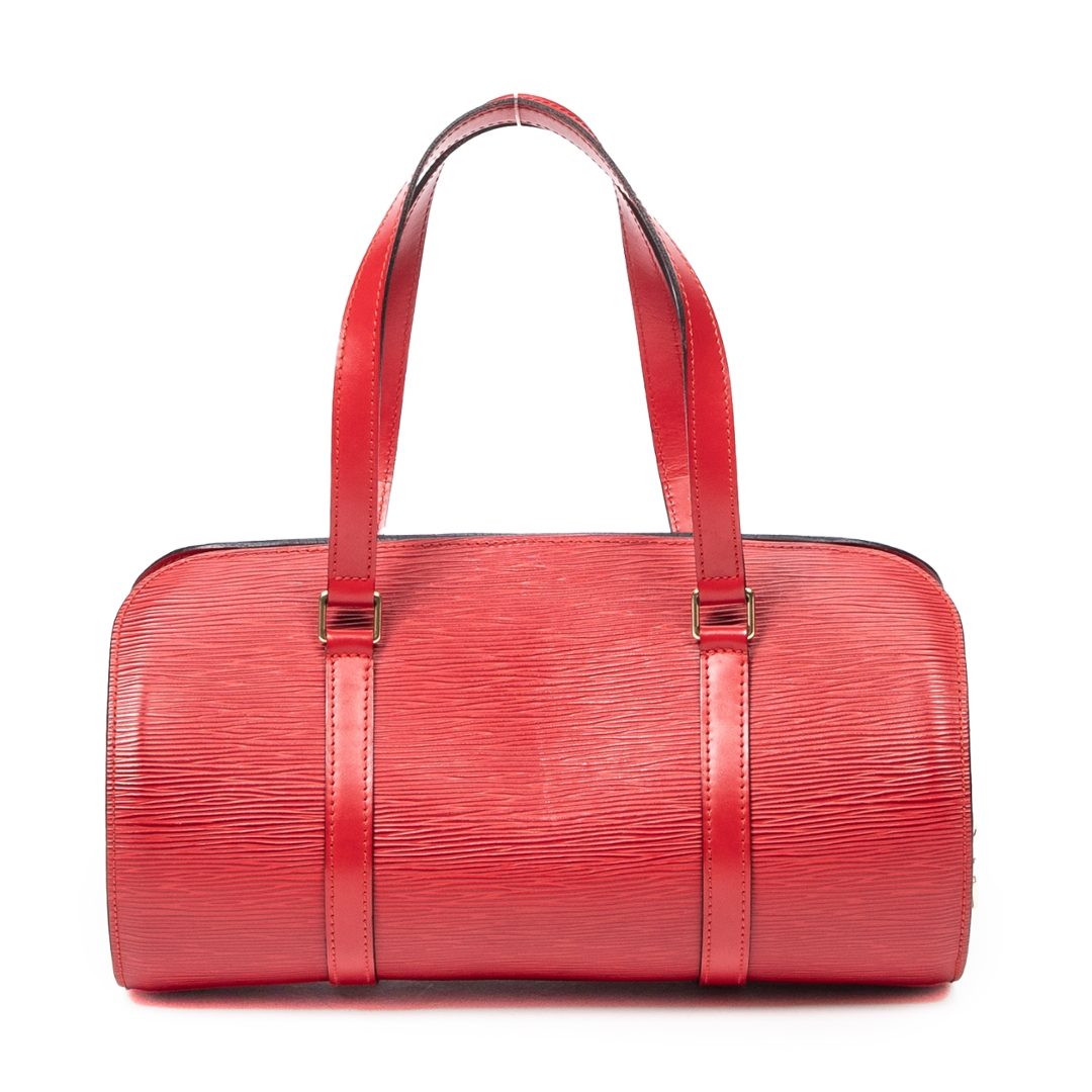 A vintage Louis Vuitton Soufflot bag crafted in striking red calf leather with the house’s signature textured finish, offering a bold yet refined interpretation of a classic cylindrical silhouette. The structured form is complemented by matching leather handles and subtle LV embossing, delivering a clean and elegant aesthetic that stands out effortlessly.