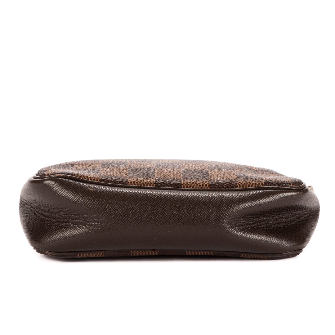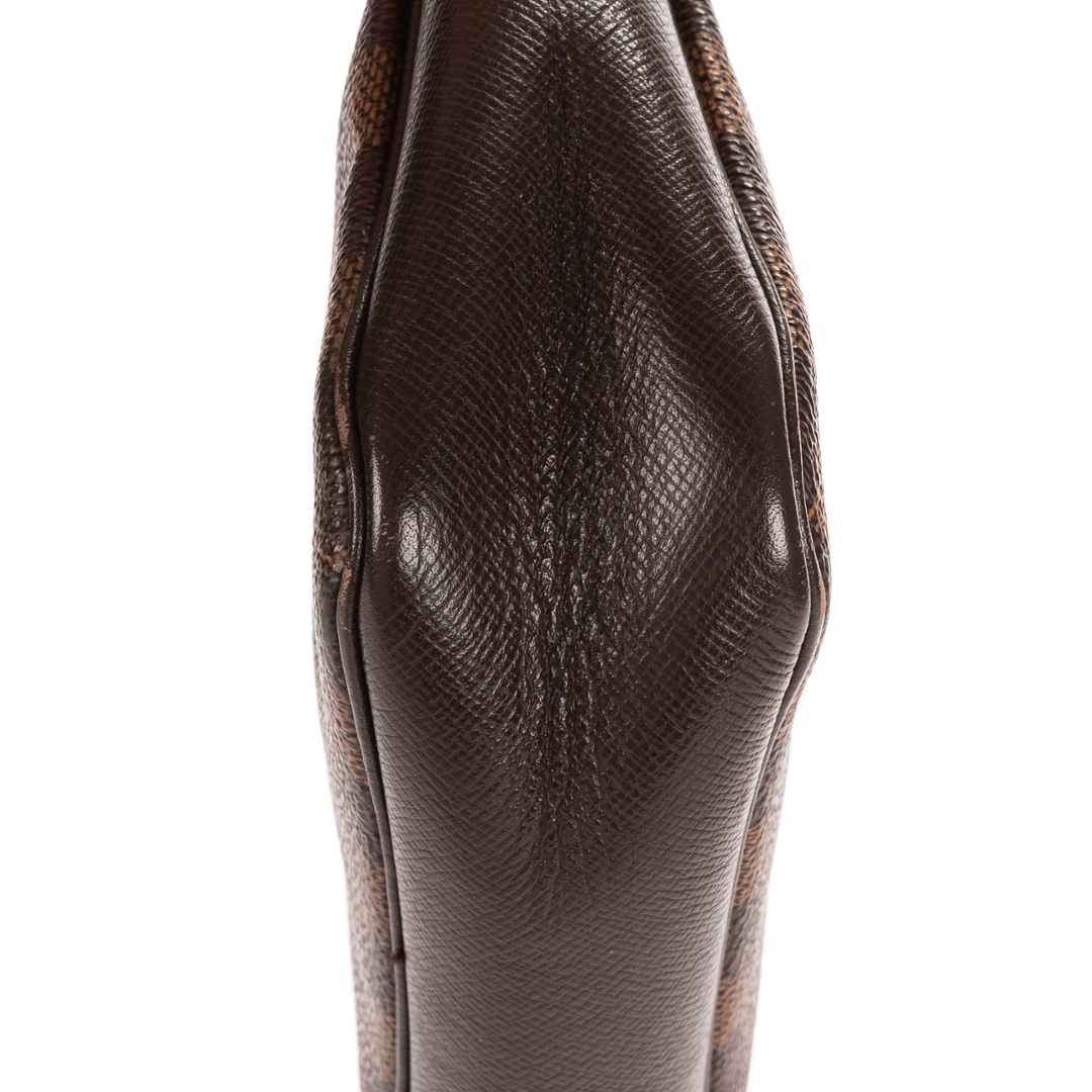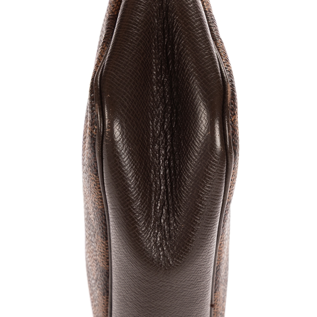 A vintage Louis Vuitton Trousse Make Up Pochette bag is a refined and versatile piece that embodies the brand’s signature sophistication. Crafted from Louis Vuitton’s iconic Damier Ebene coated canvas, it features the classic checkerboard pattern complemented by dark brown leather trim and gold-tone hardware, giving it a timeless and elegant finish.