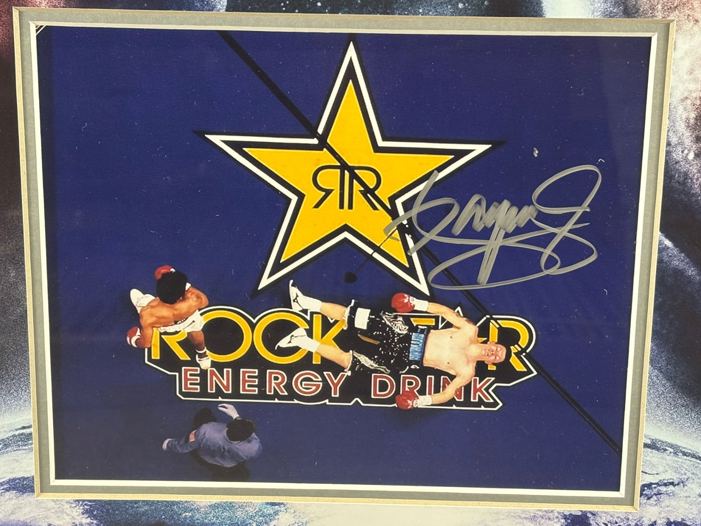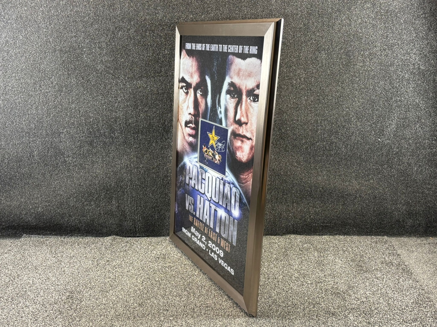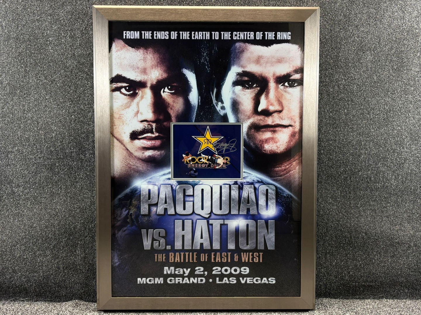 Presented in a striking silver-trimmed frame, the display measures approximately 110cm in height and 80cm in width, making it an impressive statement piece. The poster features bold fight-night artwork with powerful images of both fighters, alongside Pacquiao’s authentic signature, ensuring its uniqueness and value.