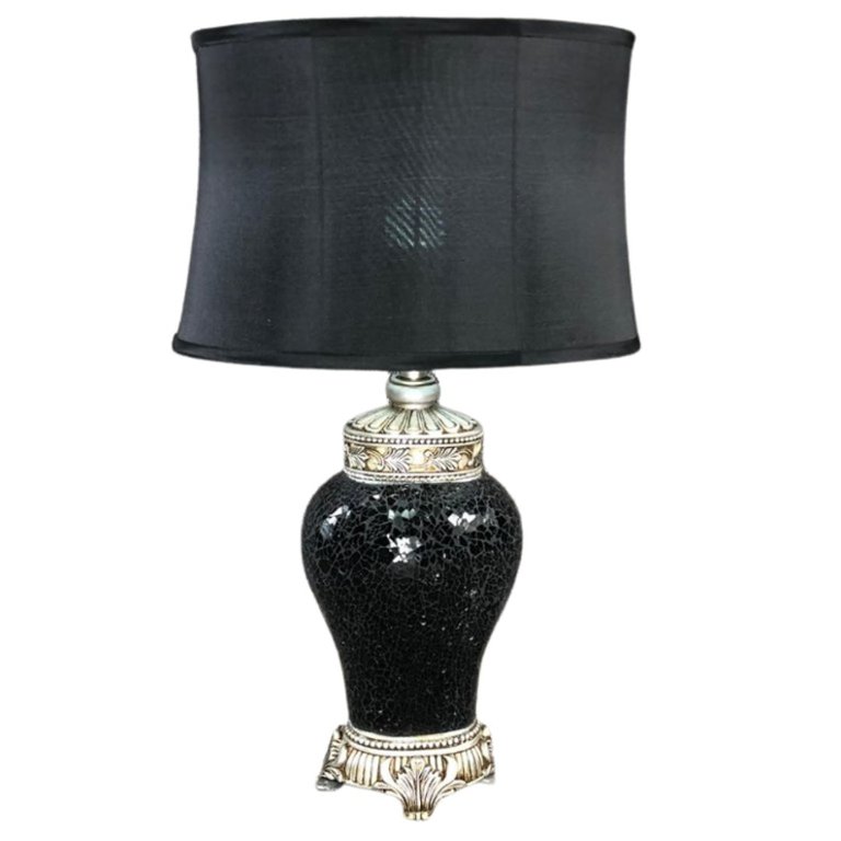 A medium table lamp makes a striking statement with its traditional silhouette and rich, contemporary detailing. Standing at approximately 25 inches tall and 14 inches wide, it features a beautifully shaped base adorned with black crushed mosaic glass, creating a stunning interplay of light and texture. The shimmering fragments catch the eye, adding depth and sophistication to any setting.