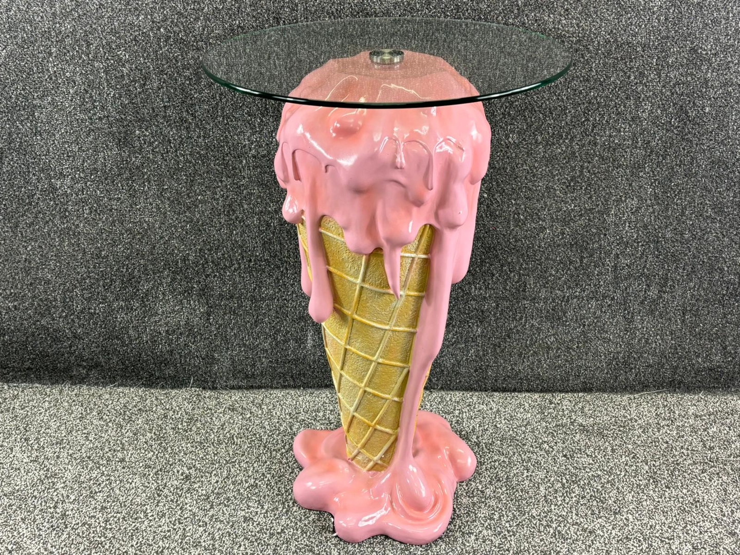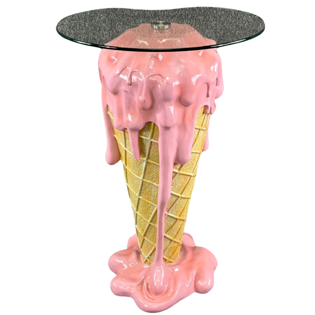 A melting Ice Cream Cone Side Table. Featuring a sleek, tempered glass top supported by a vibrant pink melting ice cream cone base, this eye-catching piece is as functional as it is fun. Measuring approximately 73cm in height, 48cm in width, and 48cm in depth, this table is the perfect size for adding charm to any room.
