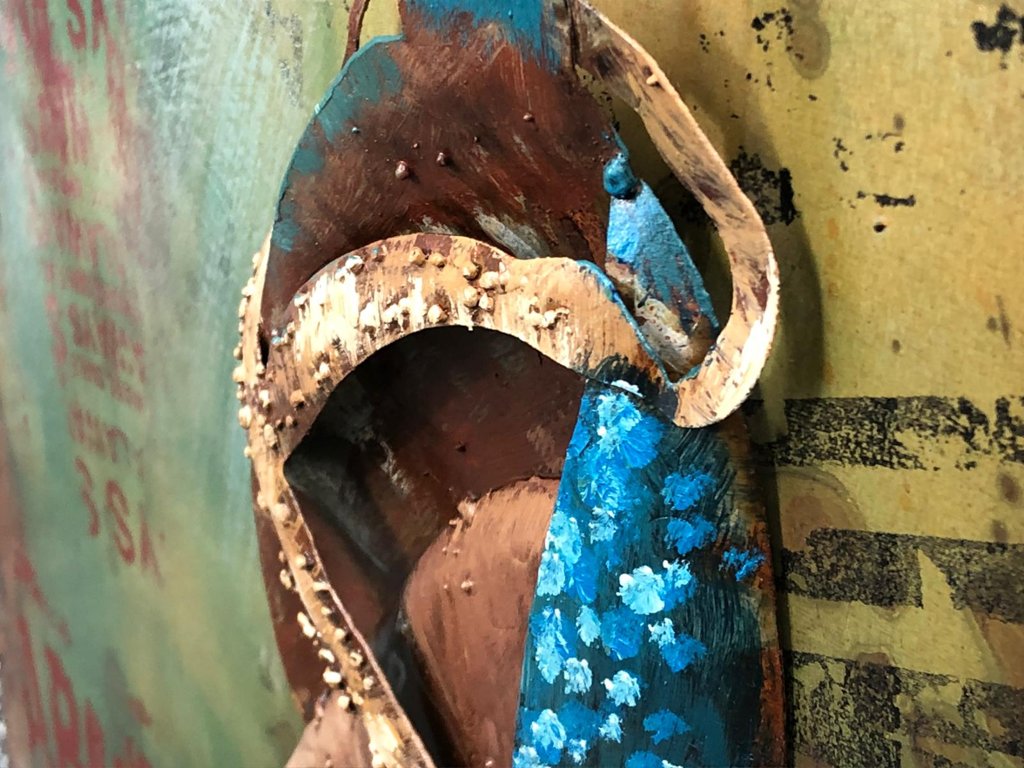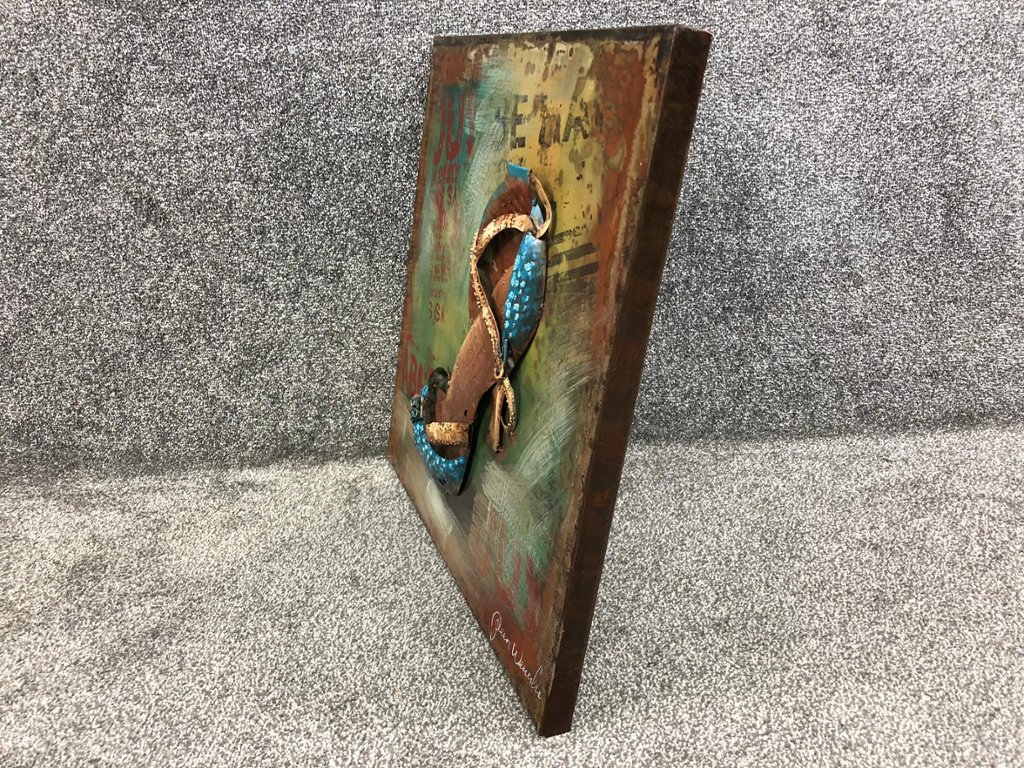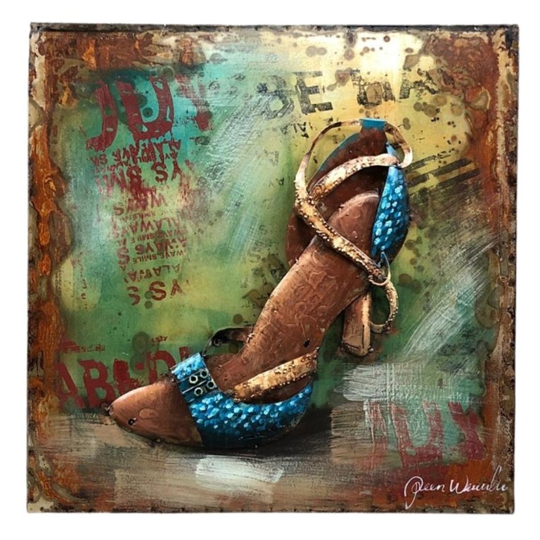 A 3D metal art piece featuring an elegant ladies' shoe. Measuring approximately 24 inches in height and 24 inches in width, this striking artwork blends industrial craftsmanship with modern artistic flair, creating a one-of-a-kind decorative piece. The textured metalwork brings depth and dimension to the design, giving the shoe a lifelike quality that seems to step right off the artwork.