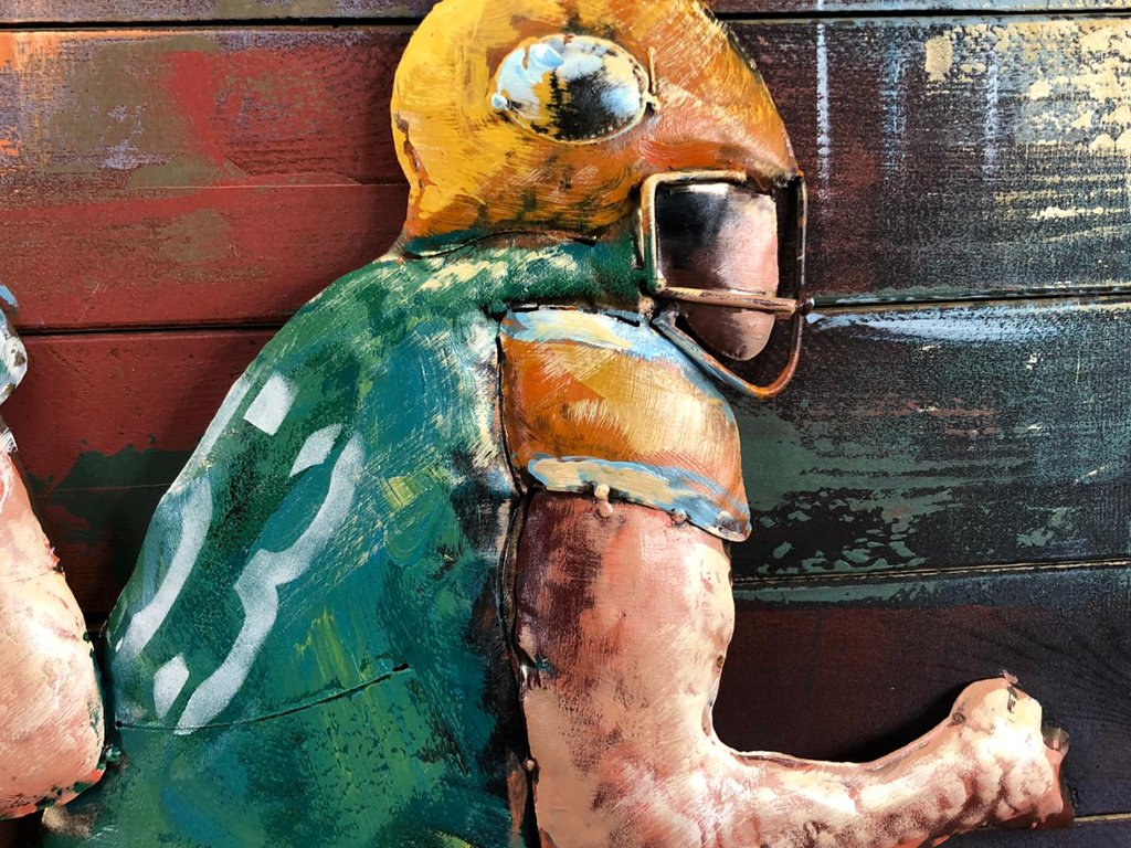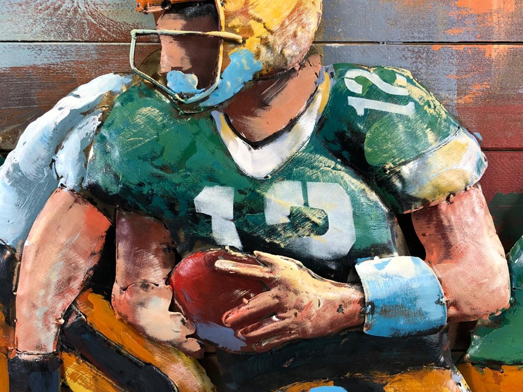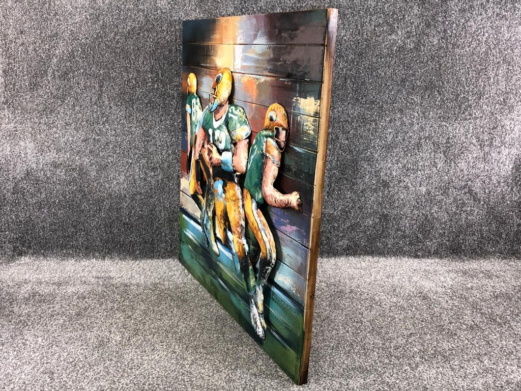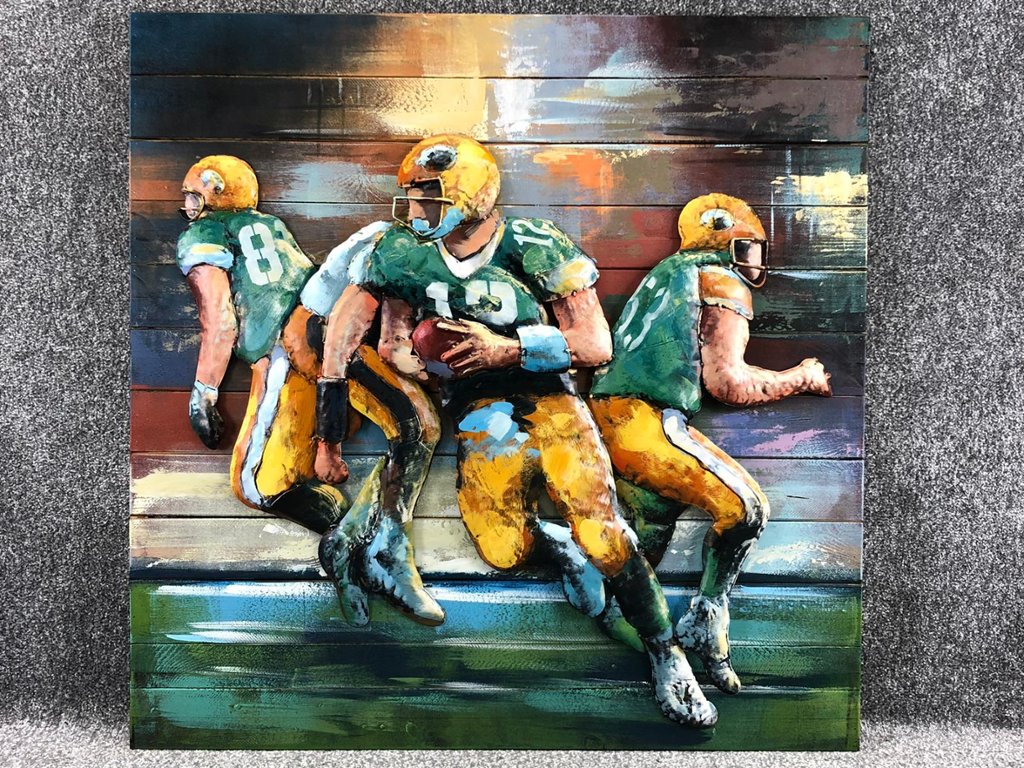 A hand painted 3D metal art picture of American Football Players. Approx 40" height, 40" width.