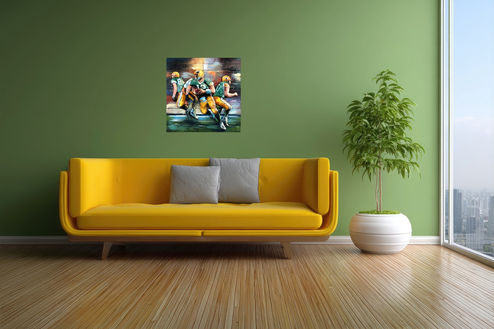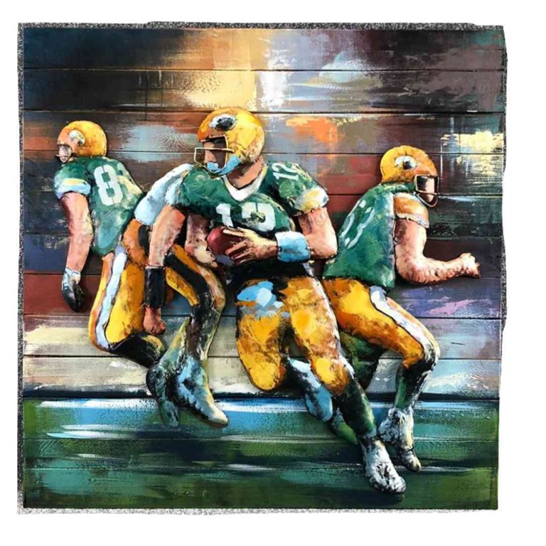 A hand-painted 3D metal art piece captures the energy and movement of American football players in action. Featuring a group of players in classic green and yellow uniforms, the artwork brings the intensity of the game to life. The central figure, a quarterback holding the football, is surrounded by teammates in dynamic poses, ready for the next play. The vivid colours of the players' uniforms stand out against the subtly textured background, which blends earthy tones with hints of sky blue and orange, suggesting a stadium atmosphere.