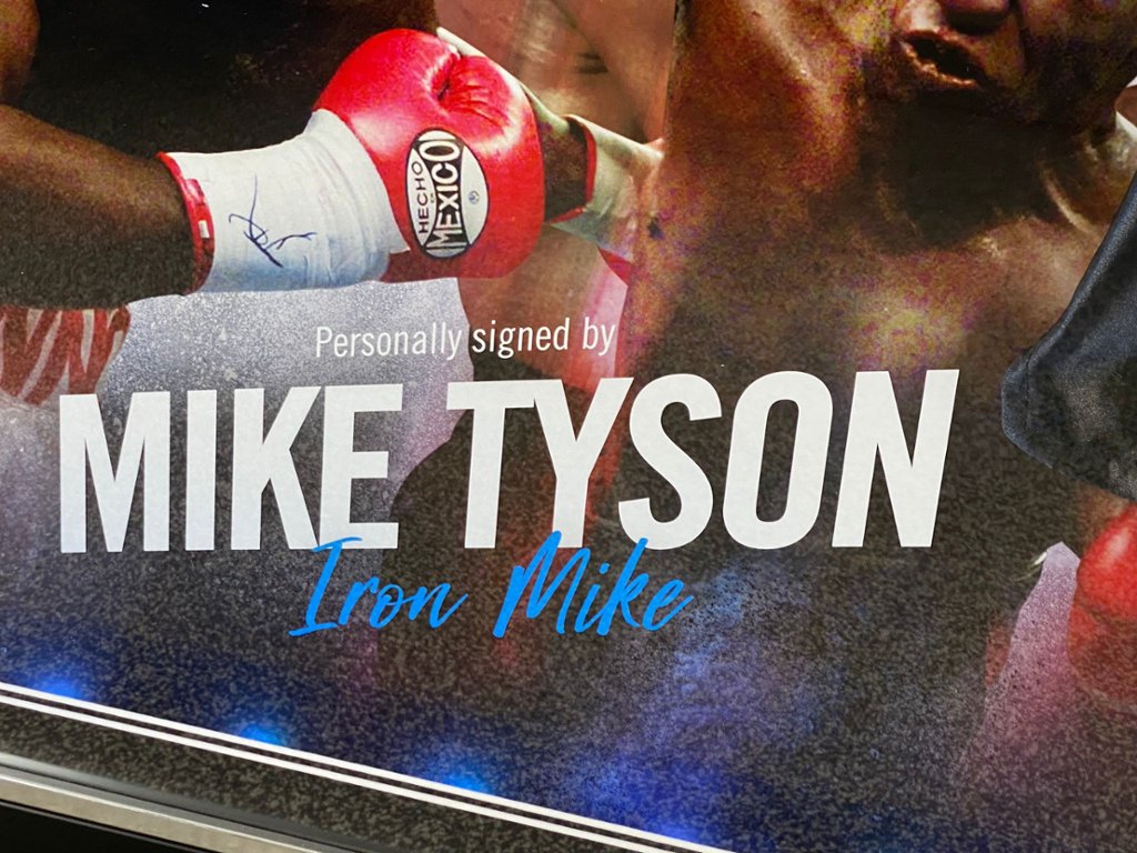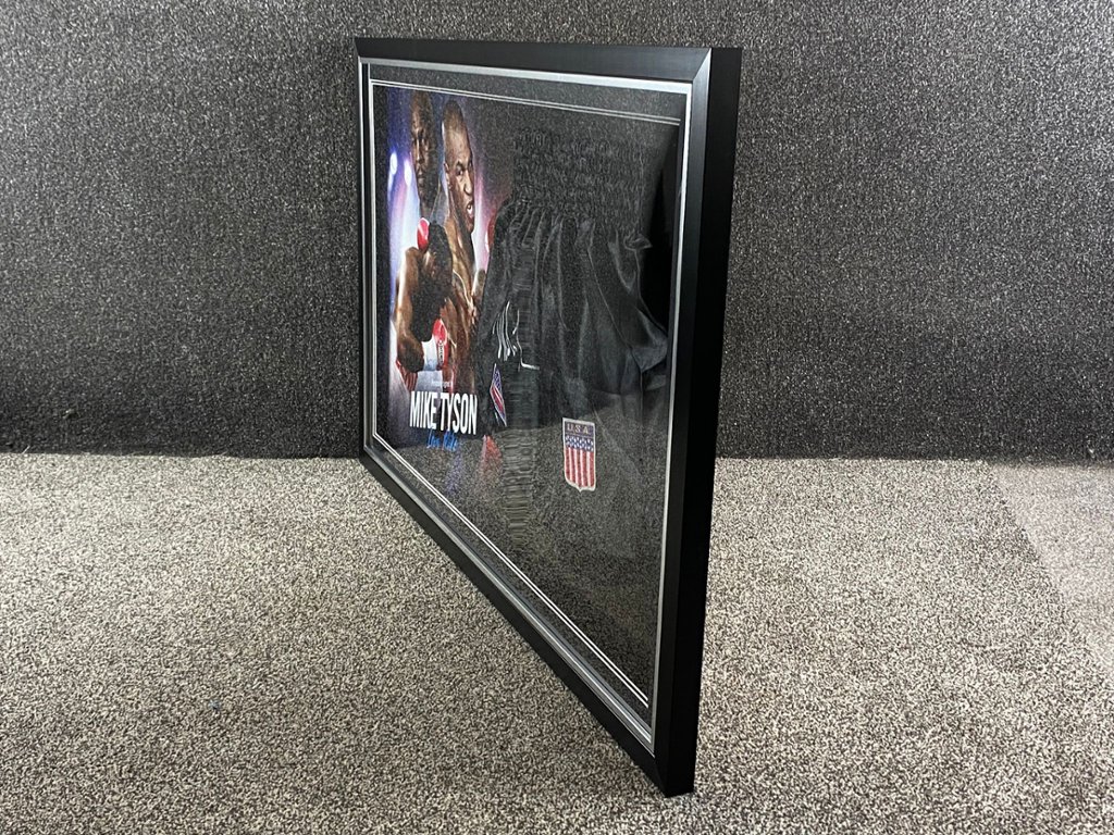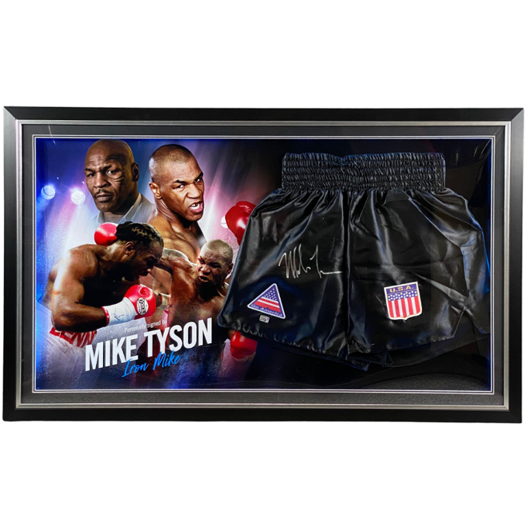 Mike Tyson's Black Boxing Shorts are elegantly showcased within a dynamic light-up presentation frame. Standing approximately 31 inches in height and 51 inches in width, this commanding display piece offers a captivating tribute to one of the sport's most iconic figures.