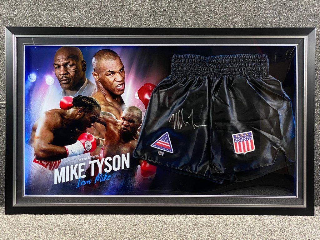 A signed & authenticated Mike Tyson Black Boxing Shorts in a light-up presentation frame. Approx 31" height, 51" width.