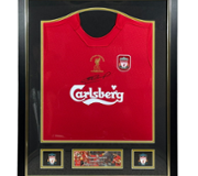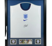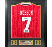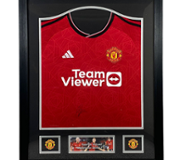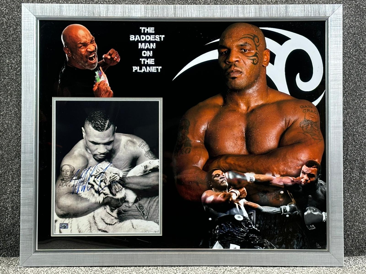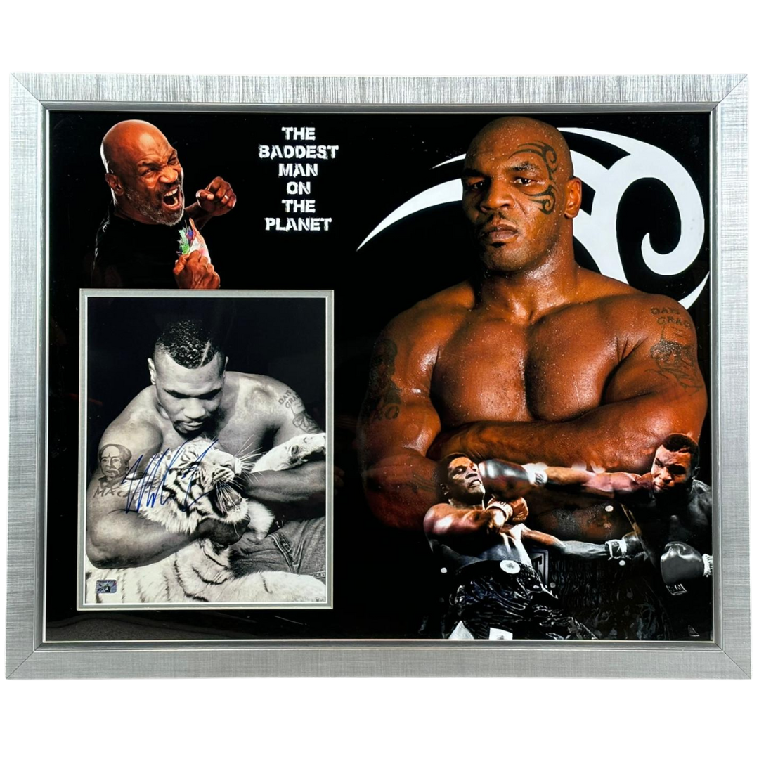 The centrepiece of this display features a rare signed photograph of Tyson cradling one of his famed tigers, showcasing his raw yet charismatic personality. Surrounding it are dynamic action shots from his electrifying boxing matches, alongside a commanding portrait of Tyson, highlighting his powerful physique and fierce demeanour in the ring. The bold typography and sleek silver frame further enhance the piece’s visual appeal, making it a standout addition to any collection.