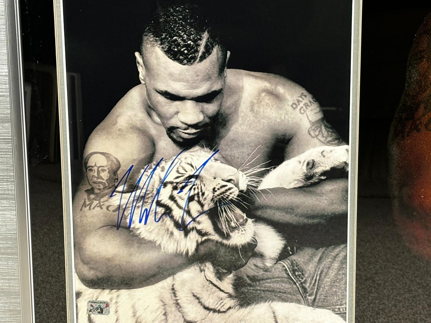 A signed & authenticated Mike Tyson Picture in a presentation frame. Approx 27" height, 33" width.