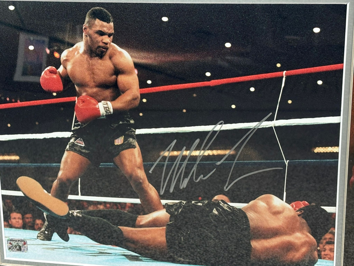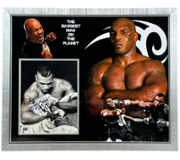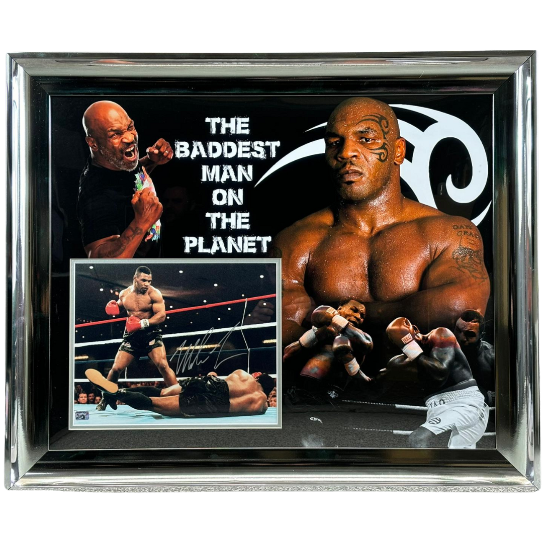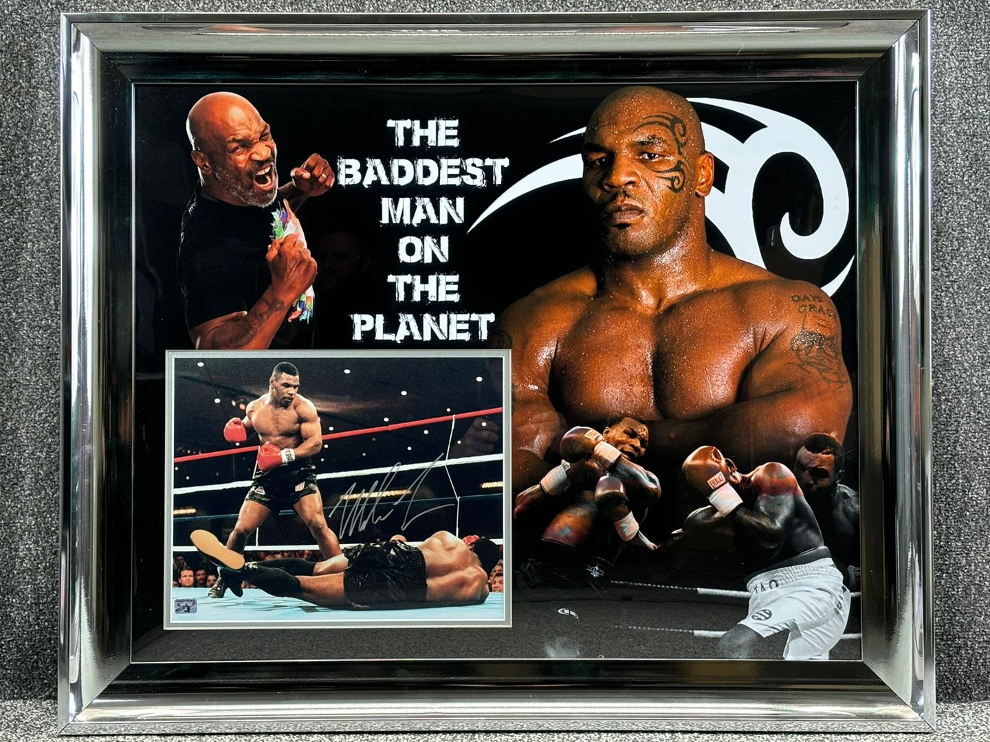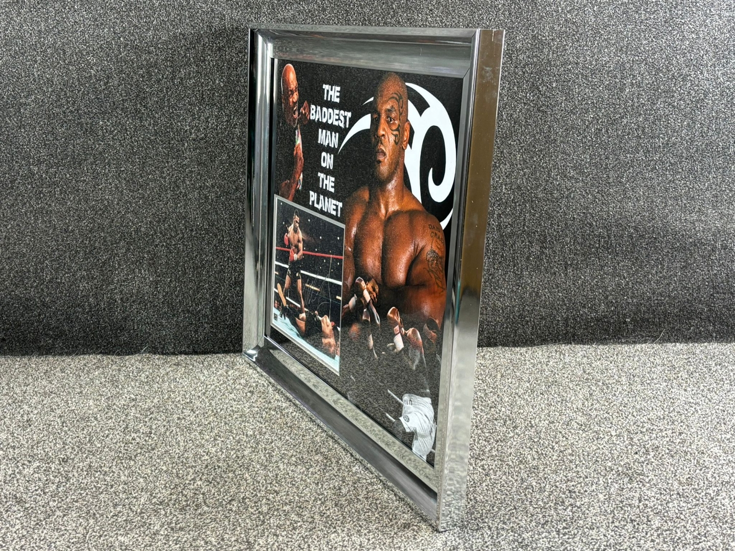A signed & authenticated Mike Tyson Picture in a presentation frame. Approx 29" height, 35" width.