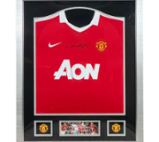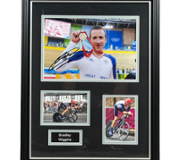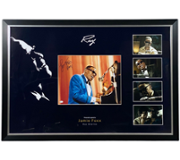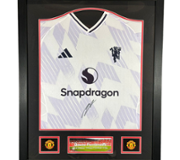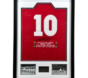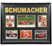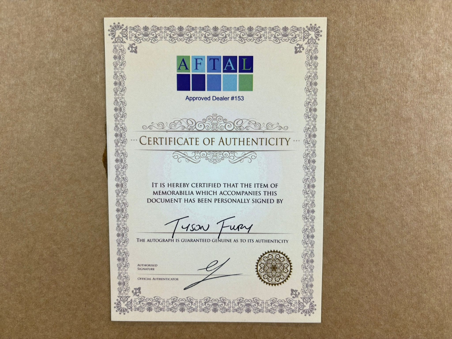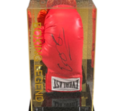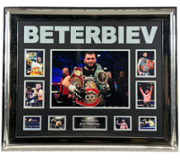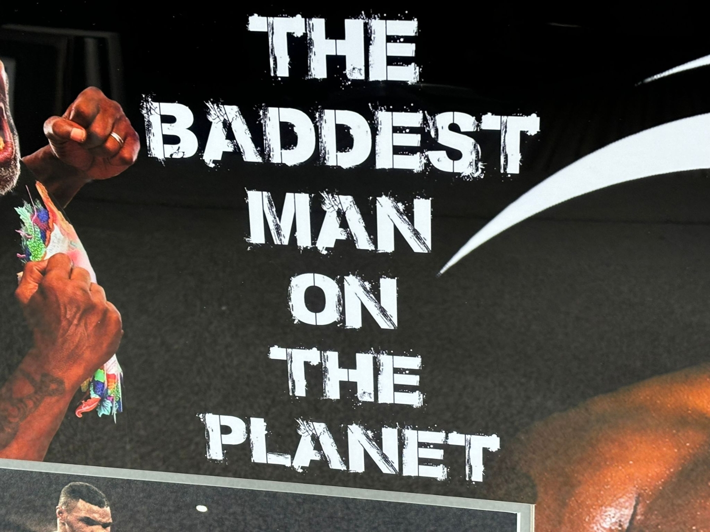 The centrepiece of this display features a rare signed photograph of Tyson cradling one of his famed tigers, showcasing his raw yet charismatic personality. Surrounding it are dynamic action shots from his electrifying boxing matches, alongside a commanding portrait of Tyson, highlighting his powerful physique and fierce demeanour in the ring. The bold typography and sleek silver frame further enhance the piece’s visual appeal, making it a standout addition to any collection.