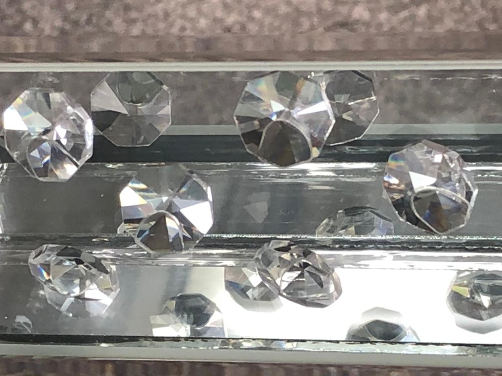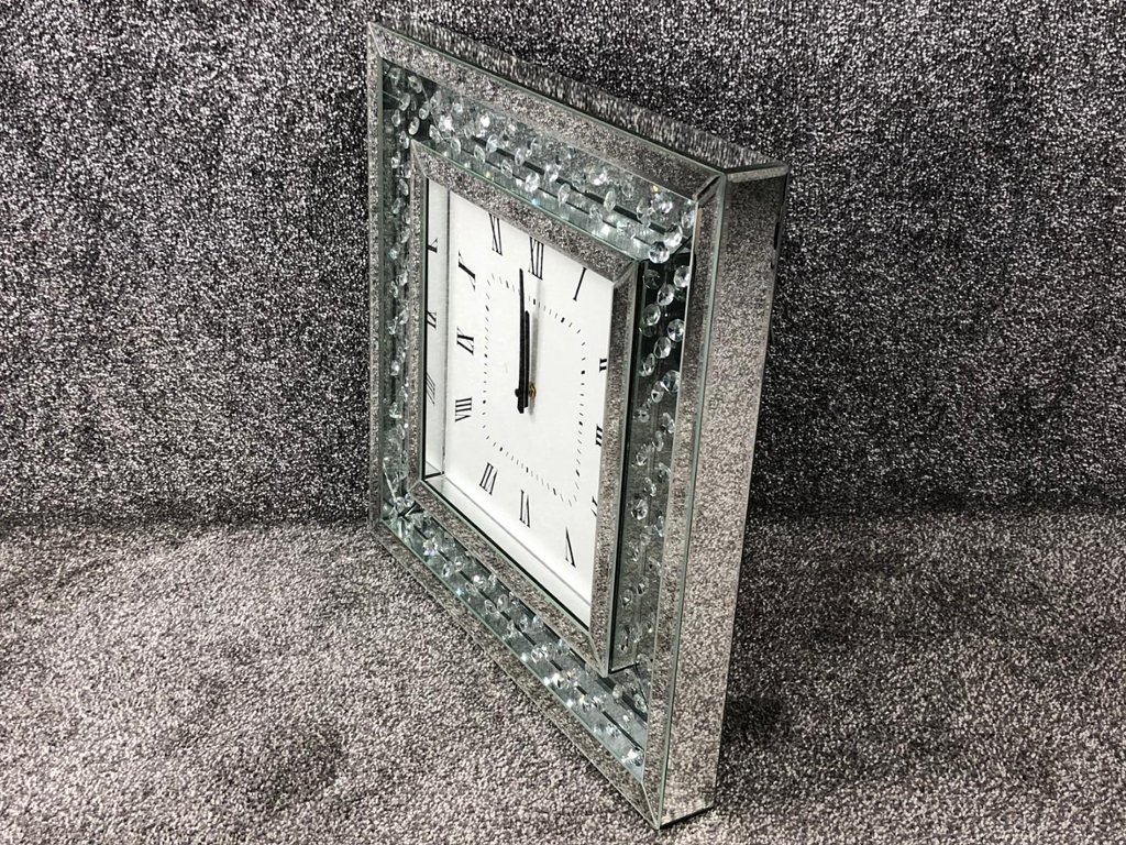 A bevelled edge mirror and floating crystal effect wall clock. Approx 20" height, 20" width