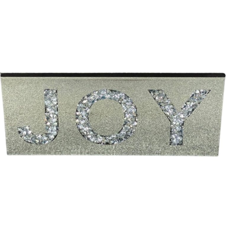 Crafted with precision, the sign features a sleek mirrored surface with bevelled edges, adding depth and dimension to its appearance. The word 'Joy' is elegantly spelt out in trapped diamante, sparkling with light and capturing attention with its dazzling allure.