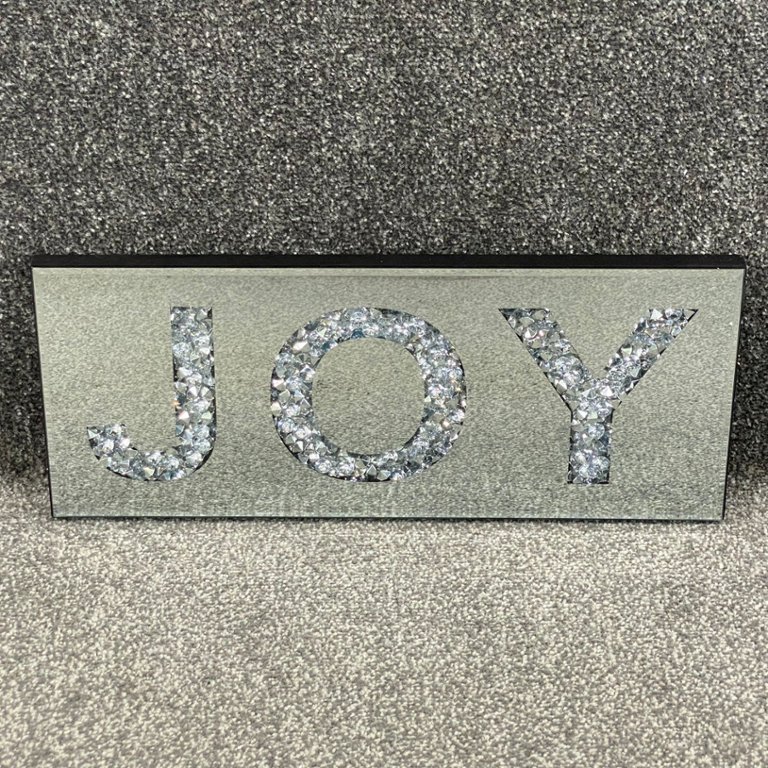 Infuse your space with elegance and positivity with this exquisite bevelled edge mirrored and trapped diamante 'Joy' sign. Measuring approximately 8 inches in height and 28 inches in width, this sign radiates charm and sophistication while spreading a message of happiness and delight.