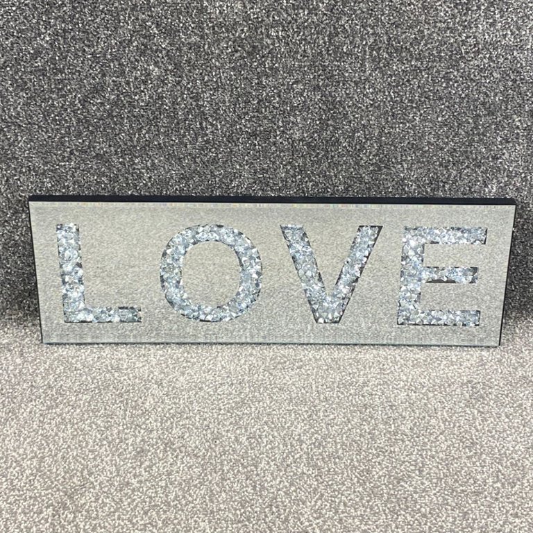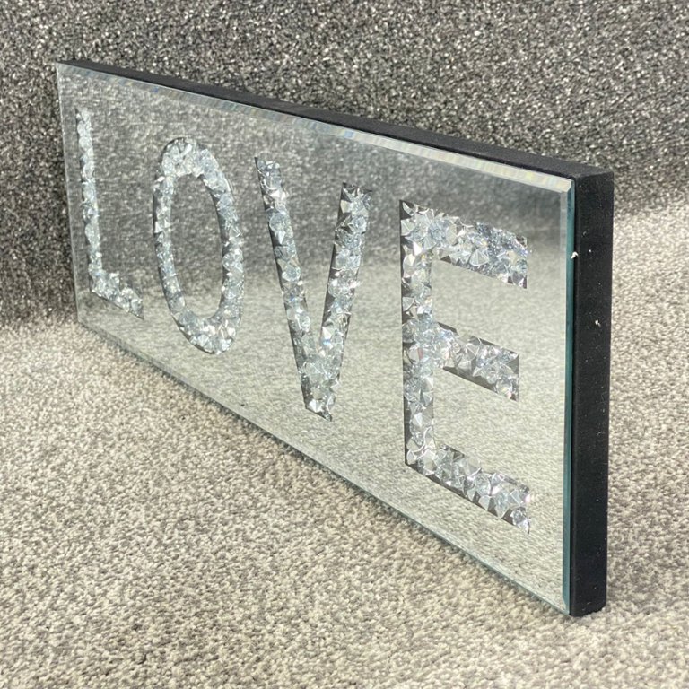A bevelled edge mirrored & trapped diamante 'Love' Sign. Approx 8" height, 24" width.