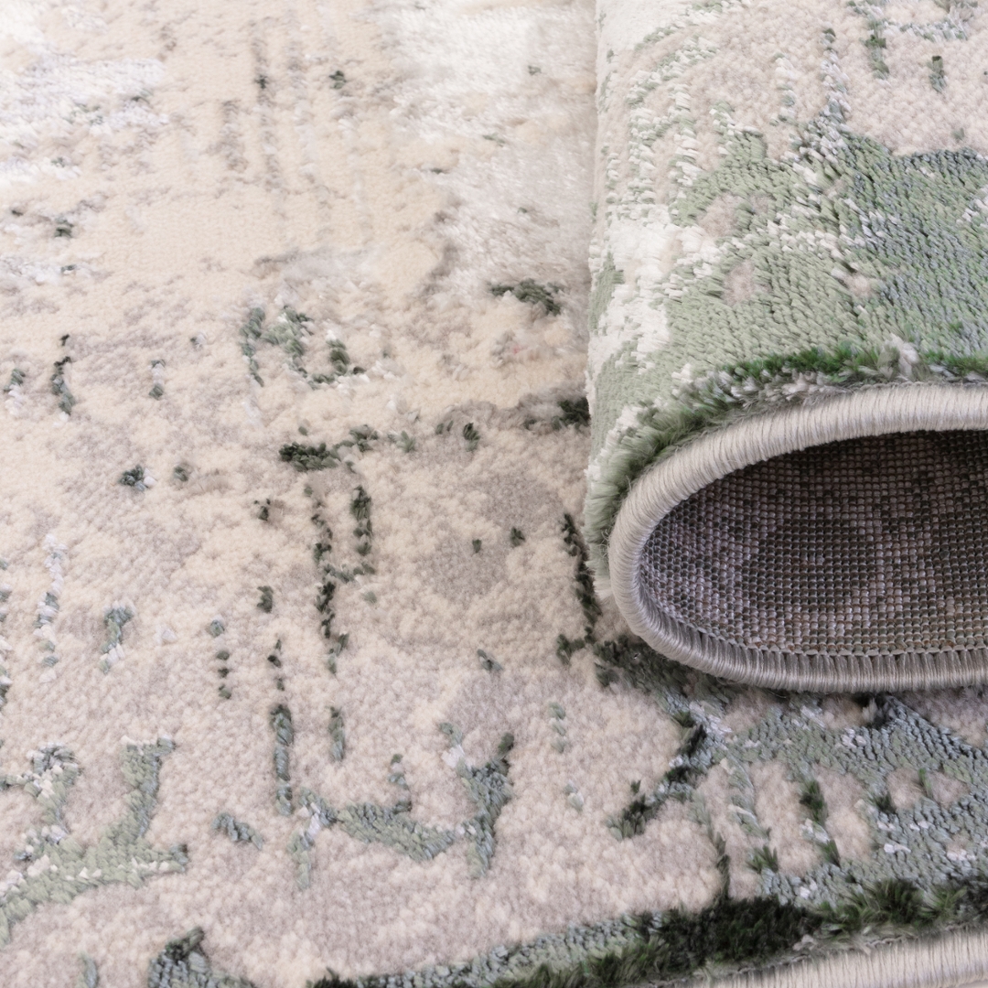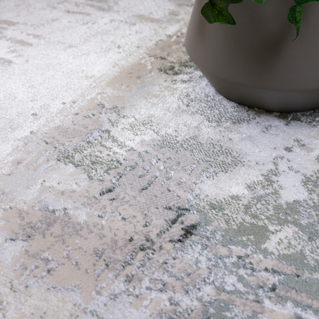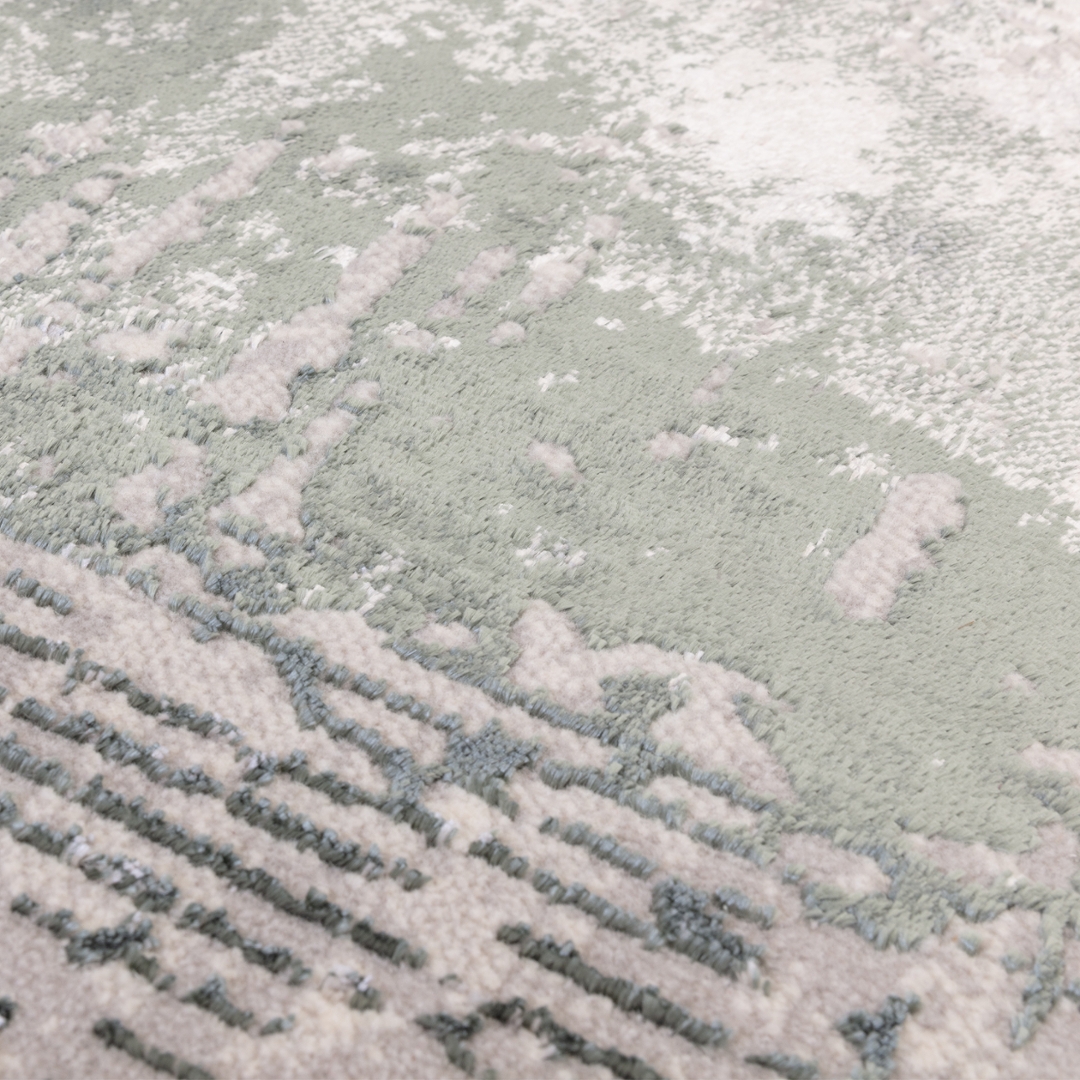 A modern green and grey distressed effect carpet boasting a captivating silk effect sheen. With dimensions of approximately 200cm by 290cm, it exudes elegance and sophistication, becoming a focal point in any room. The lustrous sheen adds a touch of opulence, while the modern design complements contemporary decor effortlessly. Whether gracing your living room, bedroom, or dining area, its plush texture and exquisite craftsmanship promise to enhance your home's ambience. Immerse yourself in the sumptuous comfort and timeless allure of this modern carpet, where style meets functionality in perfect harmony.