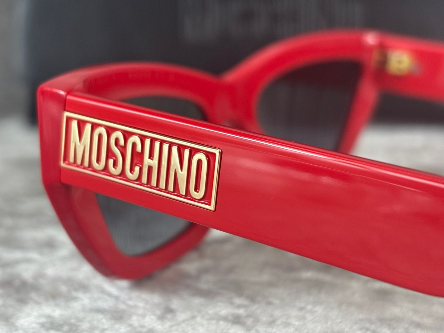 Signature Moschino branding in gold-tone detailing along the temples adds a luxurious statement element, reinforcing the brand’s playful yet high-fashion identity. The smooth, sculpted acetate frame offers both comfort and durability, making these sunglasses as practical as they are eye-catching.