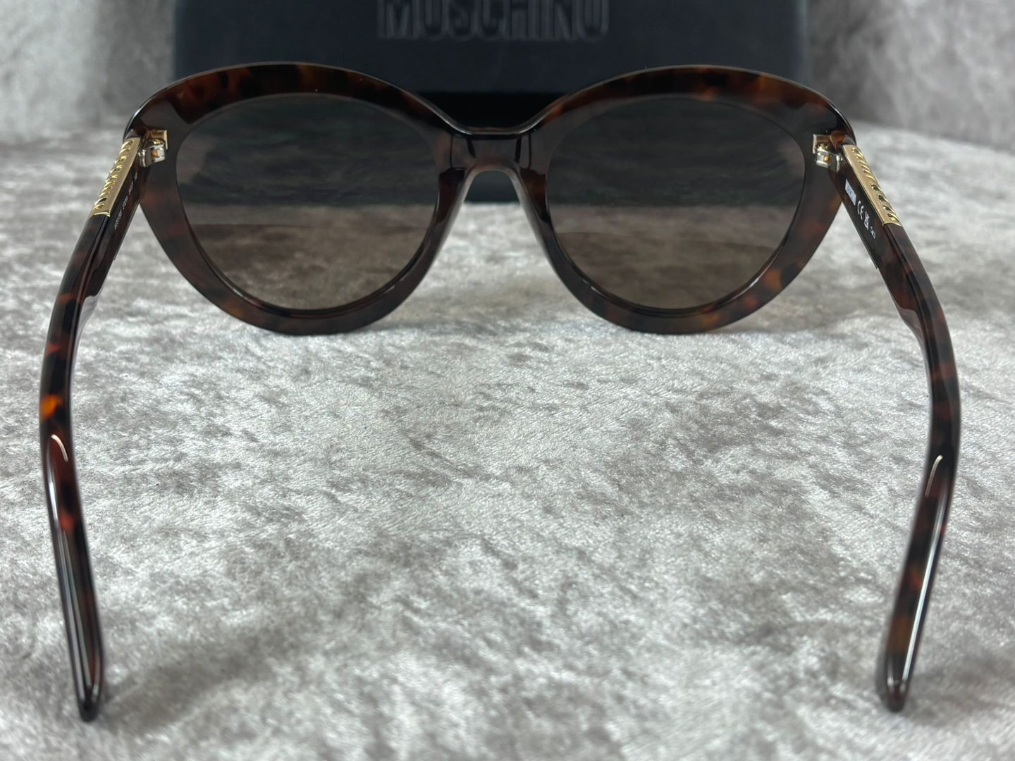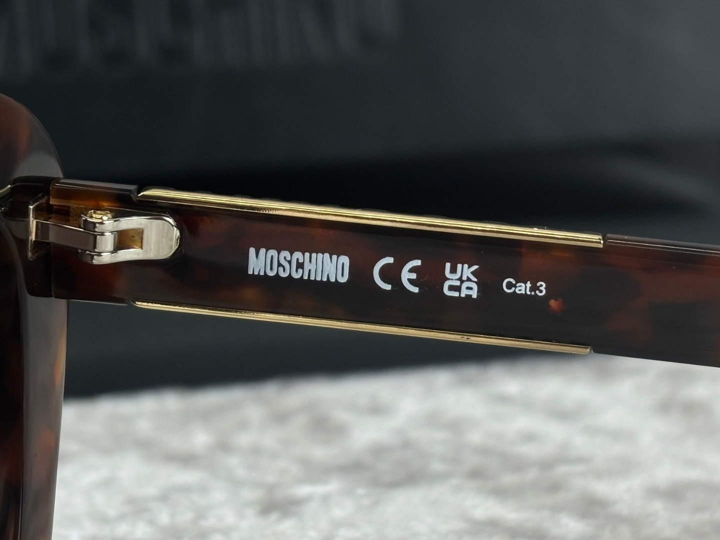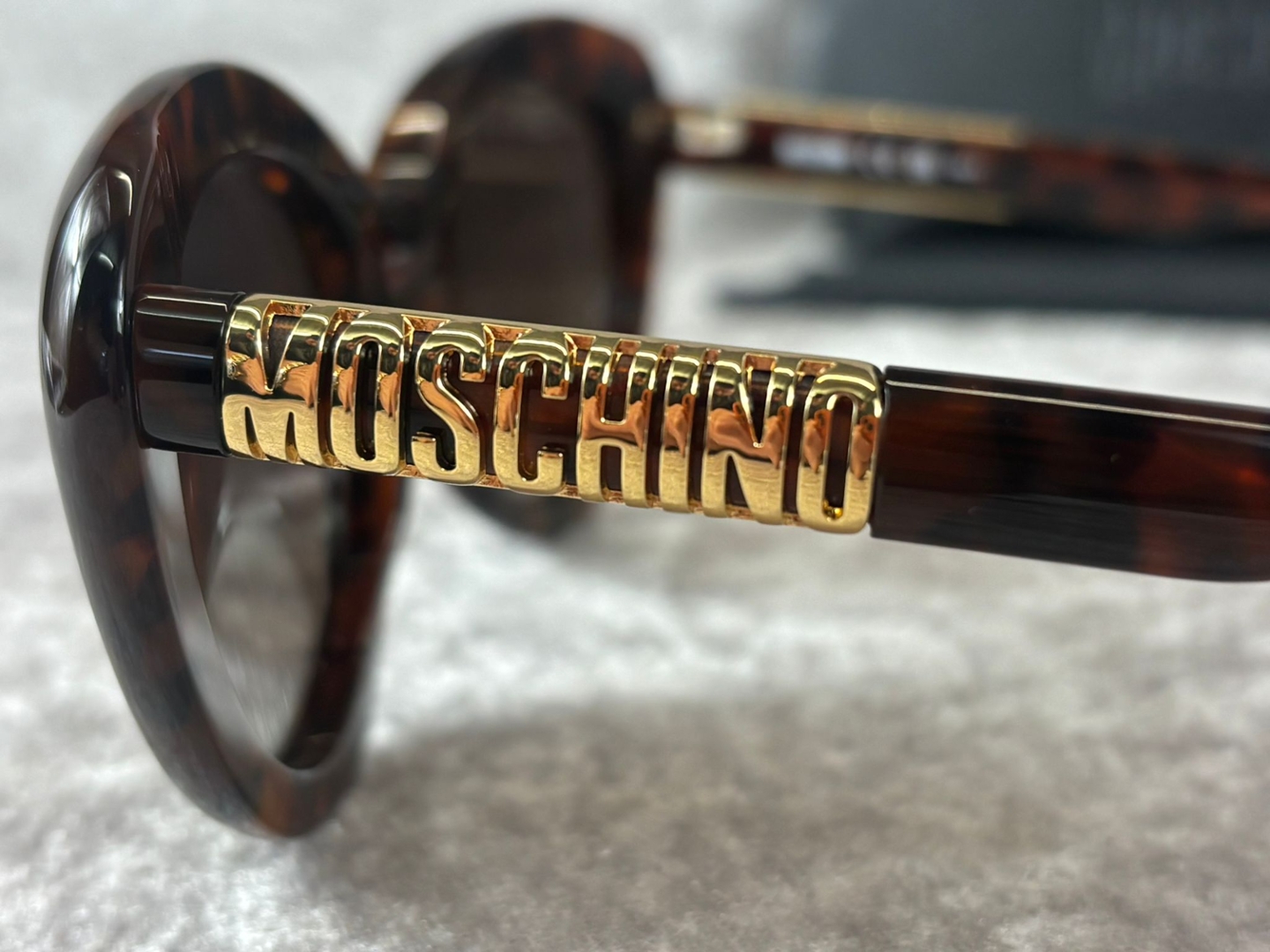 Signature Moschino detailing along the temples adds a bold designer touch, with gold-tone branding that elevates the overall look. The sculpted arms and smooth curves highlight the brand’s playful yet sophisticated approach to eyewear design, ensuring these sunglasses stand out whether styled casually or for a more glamorous occasion.