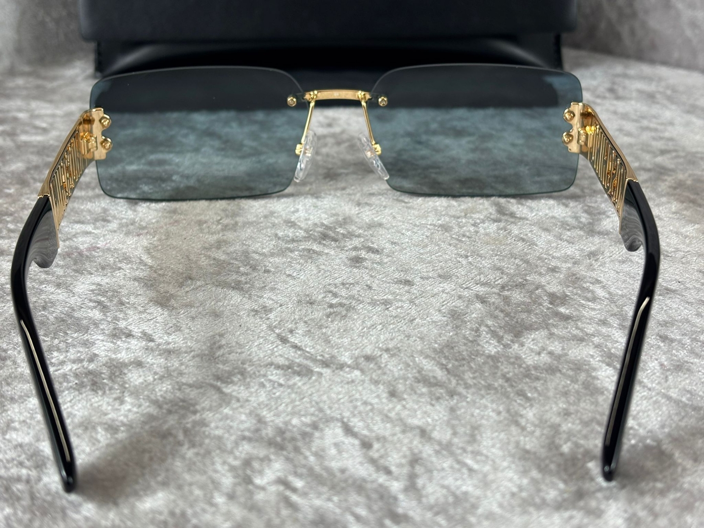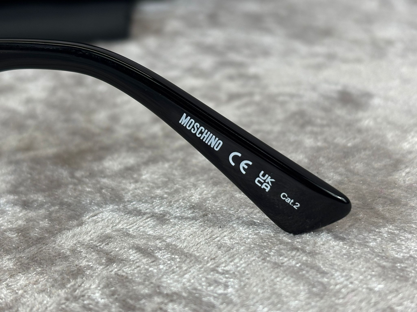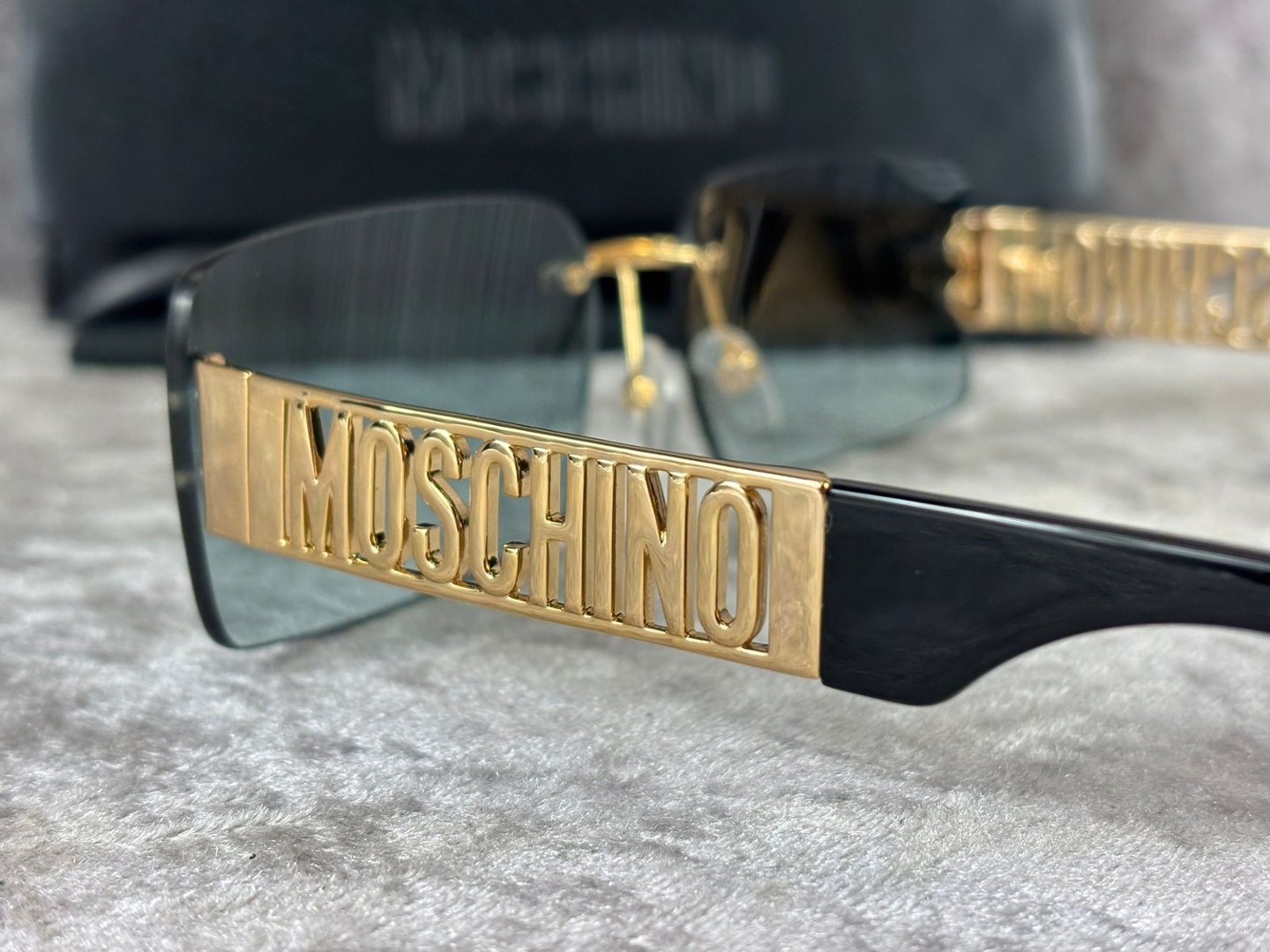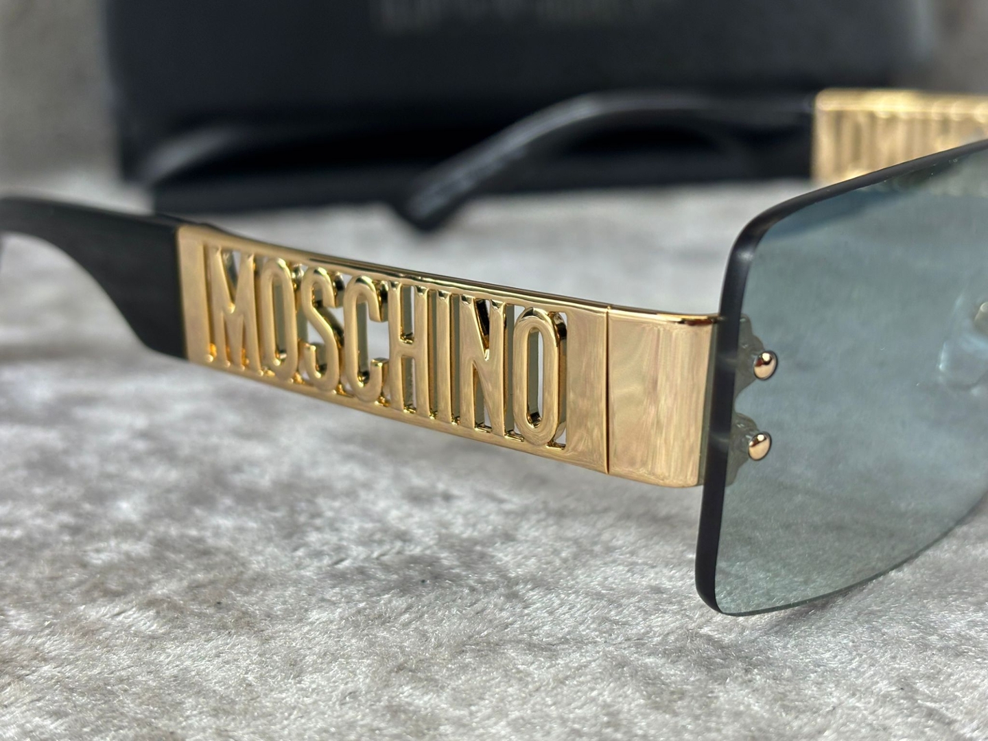 The standout detail lies in the gold MOSCHINO lettering integrated along the arms, giving the sunglasses an instantly recognisable luxury edge. The rimless construction keeps the look modern and lightweight, while the structured rectangular shape adds a confident, fashion-forward finish. Designed to turn heads, this pair perfectly balances minimal lens styling with bold branding.