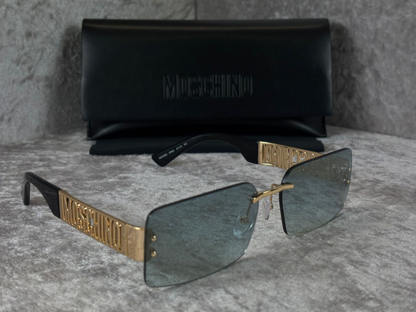A Brand new, unused pair of Moschino Rectangular - Teal Gold Sunglasses.