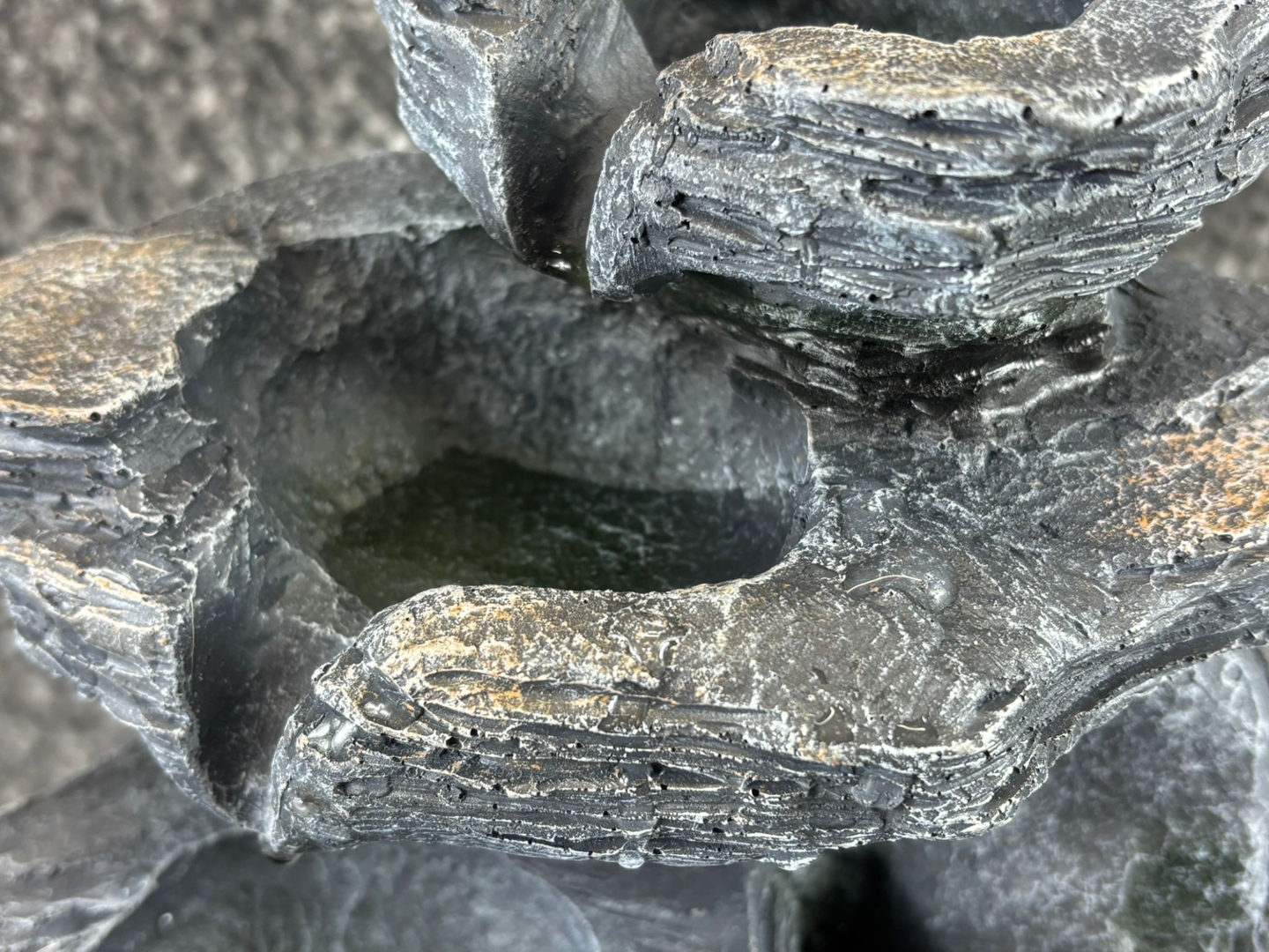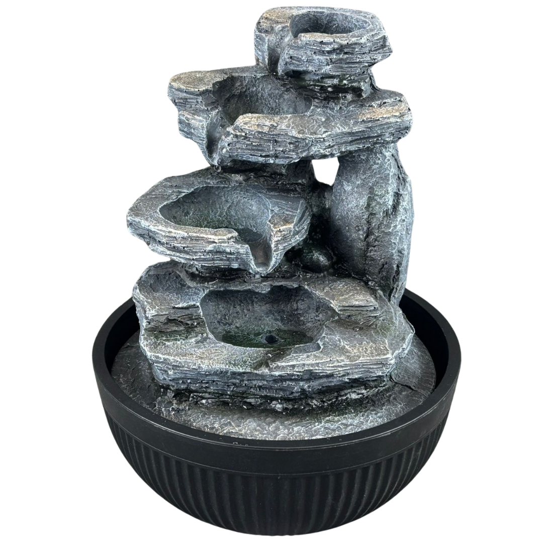 A Mountain Stream Water Fountain. Designed to mimic the look of weathered rock formations, this fountain features a cascading multi-tier design where water flows gently from one level to the next. The effect is both visually striking and deeply calming, creating the perfect focal point for any room or garden.