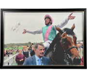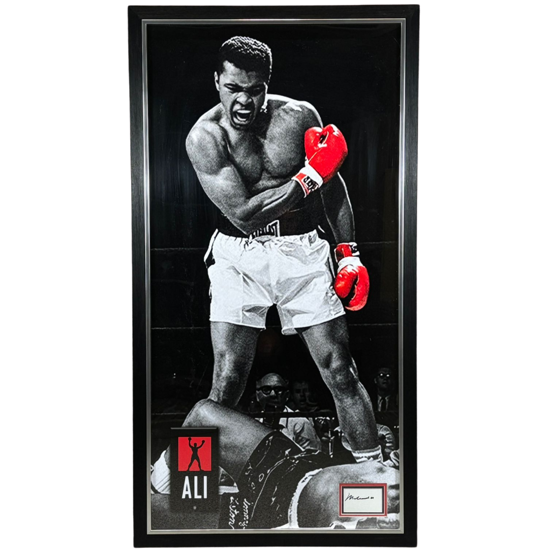 A signed and authenticated Muhammad Ali boxing picture, presented in a striking display frame measuring approximately 129cm in height and 69cm in width. This iconic image captures one of the most famous moments in sporting history, with Ali standing tall in triumph, embodying the power, charisma, and legacy of “The Greatest.” His signature, displayed clearly beneath the image, elevates this piece into a truly remarkable collector’s item.