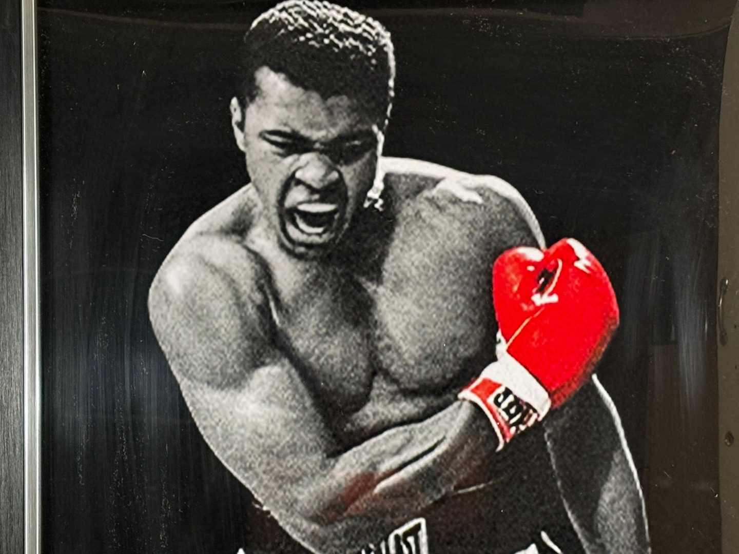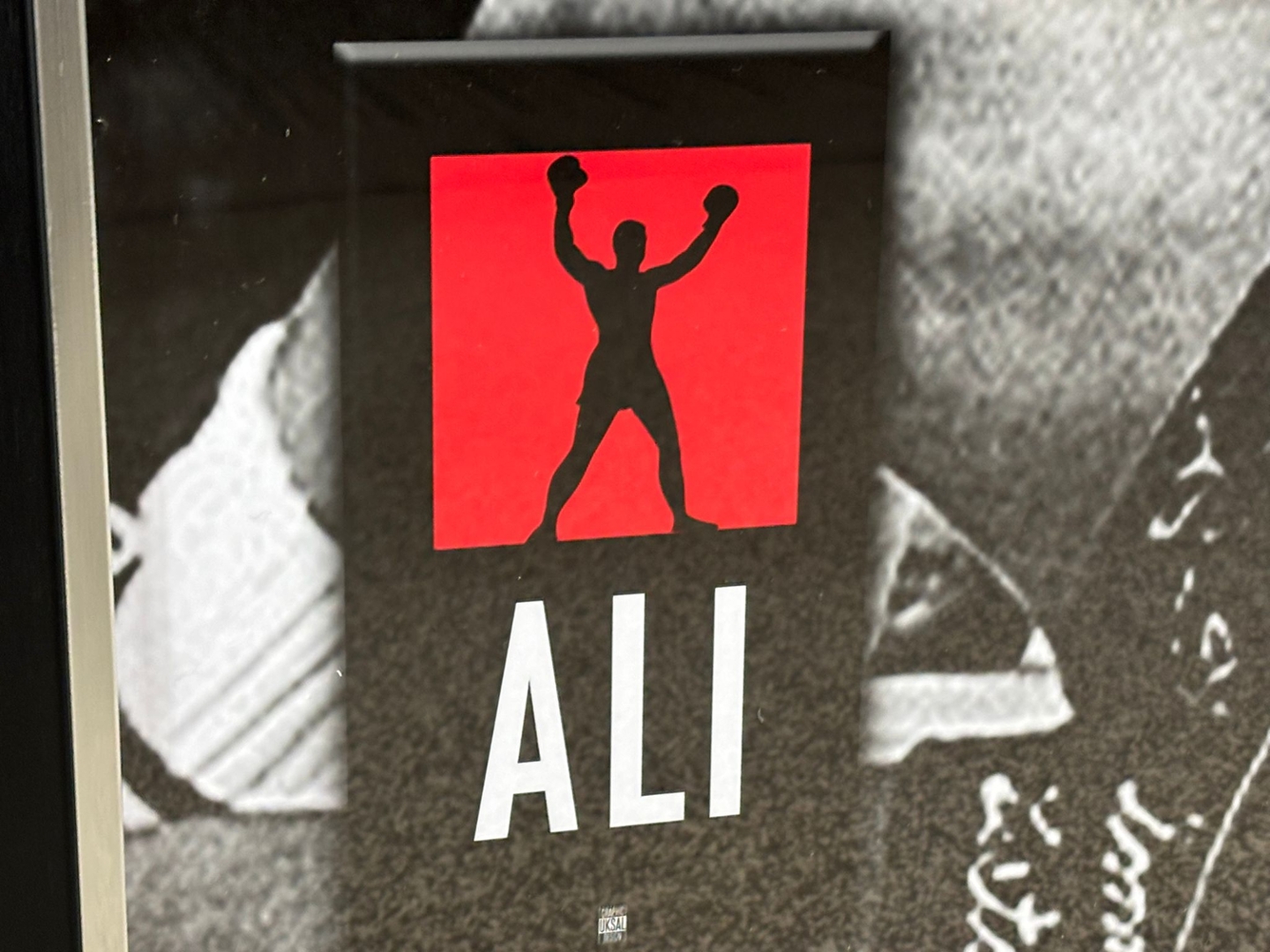 The monochrome photograph, accented by Ali’s vivid red gloves, creates a dramatic and timeless presentation. Professionally mounted and framed, it features a sleek black surround that enhances the impact of the image and ensures it stands out as a centrepiece in any space.