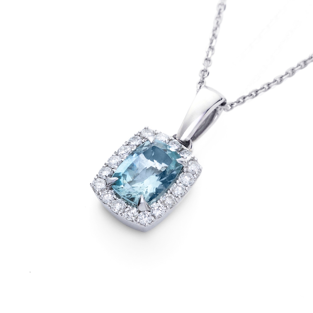 A brand-new, unused, certified natural diamond & aquamarine cushion-shaped cluster pendant, with one cushion mixed-cut aquamarine gemstone at the centre & a cluster of brilliant-cut diamonds in a halo setting, in 9ct white gold.