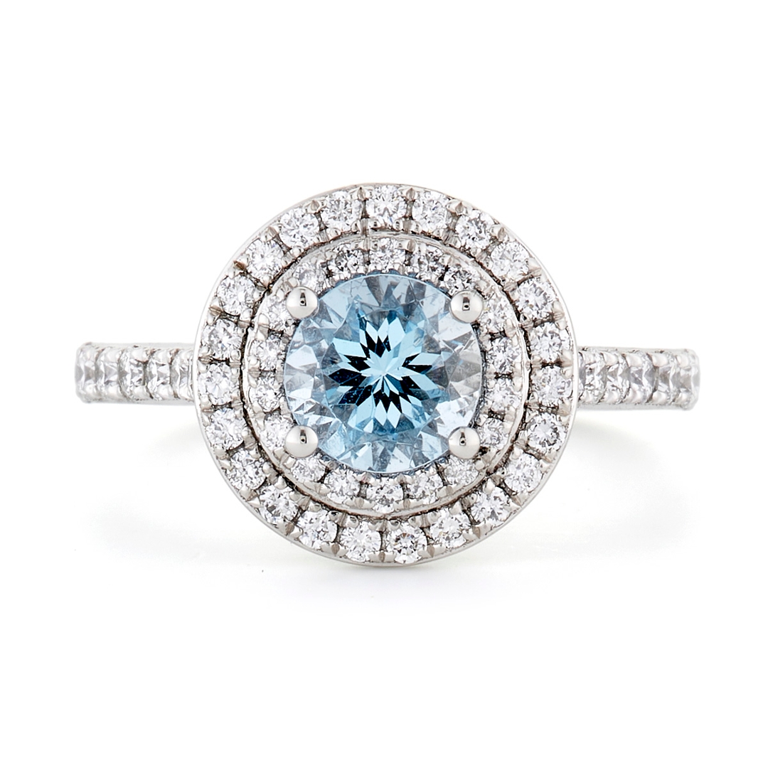 A brand new, unused, certified natural diamond & aquamarine gemstone round-shaped cluster ring, set with one round mixed cut aquamarine gemstone to the centre & a cluster of brilliant cut diamonds in a double halo setting & to the shoulders, set in platinum.