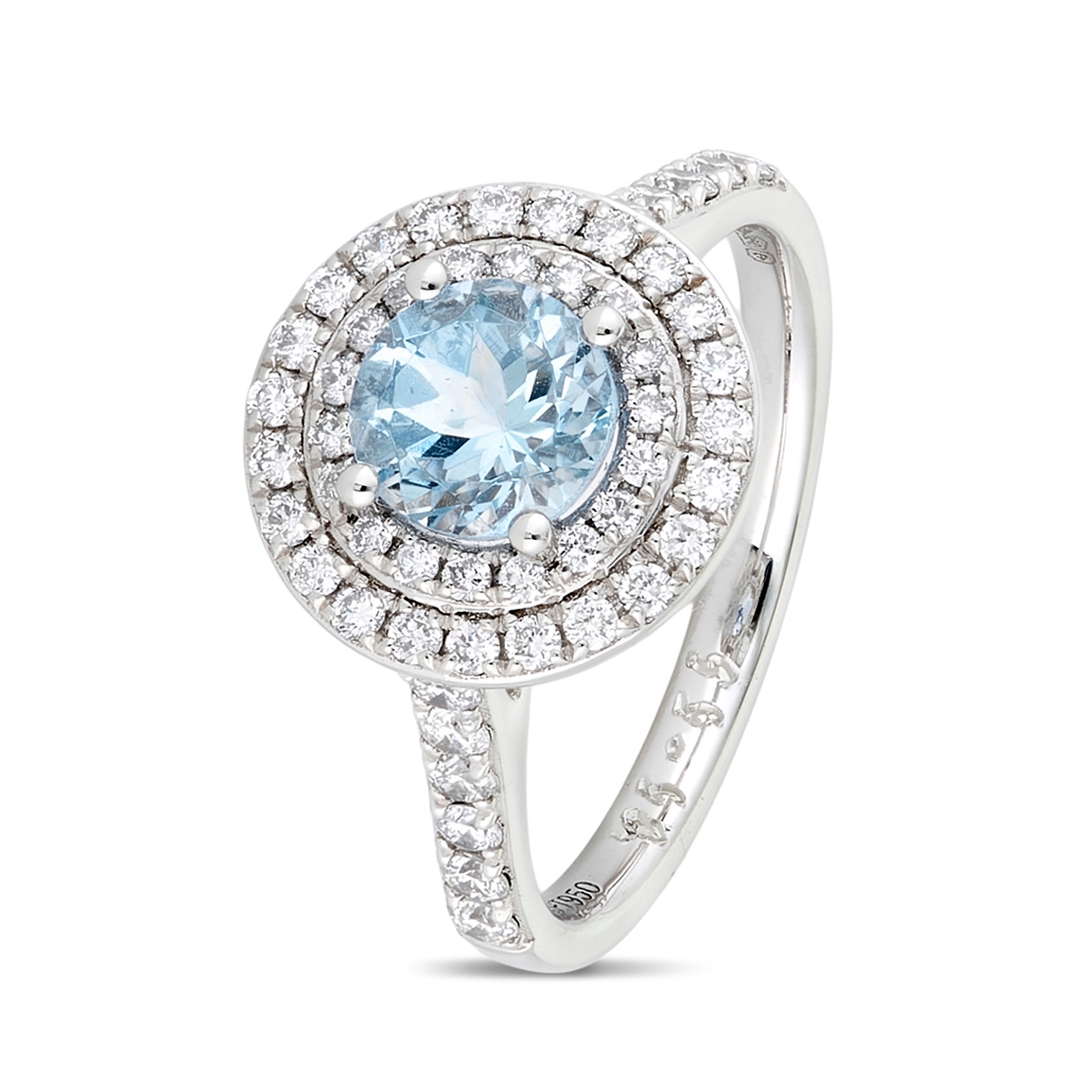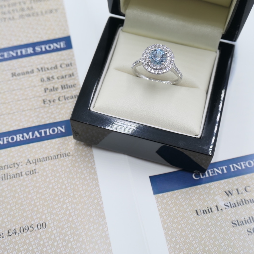 A brand-new, unused, certified platinum, natural-diamond and aquamarine round-shaped cluster ring, this stunning piece embodies true elegance and refined beauty. At its centre, a 0.85ct round mixed-cut aquamarine sparkles, displaying a delicate pale blue hue reminiscent of clear skies and tranquil seas—symbolising serenity, clarity, and timeless charm. Surrounding the centre stone is a luxurious double halo of brilliant-cut natural diamonds, with further diamonds flowing along the shoulders for added brilliance and grandeur.