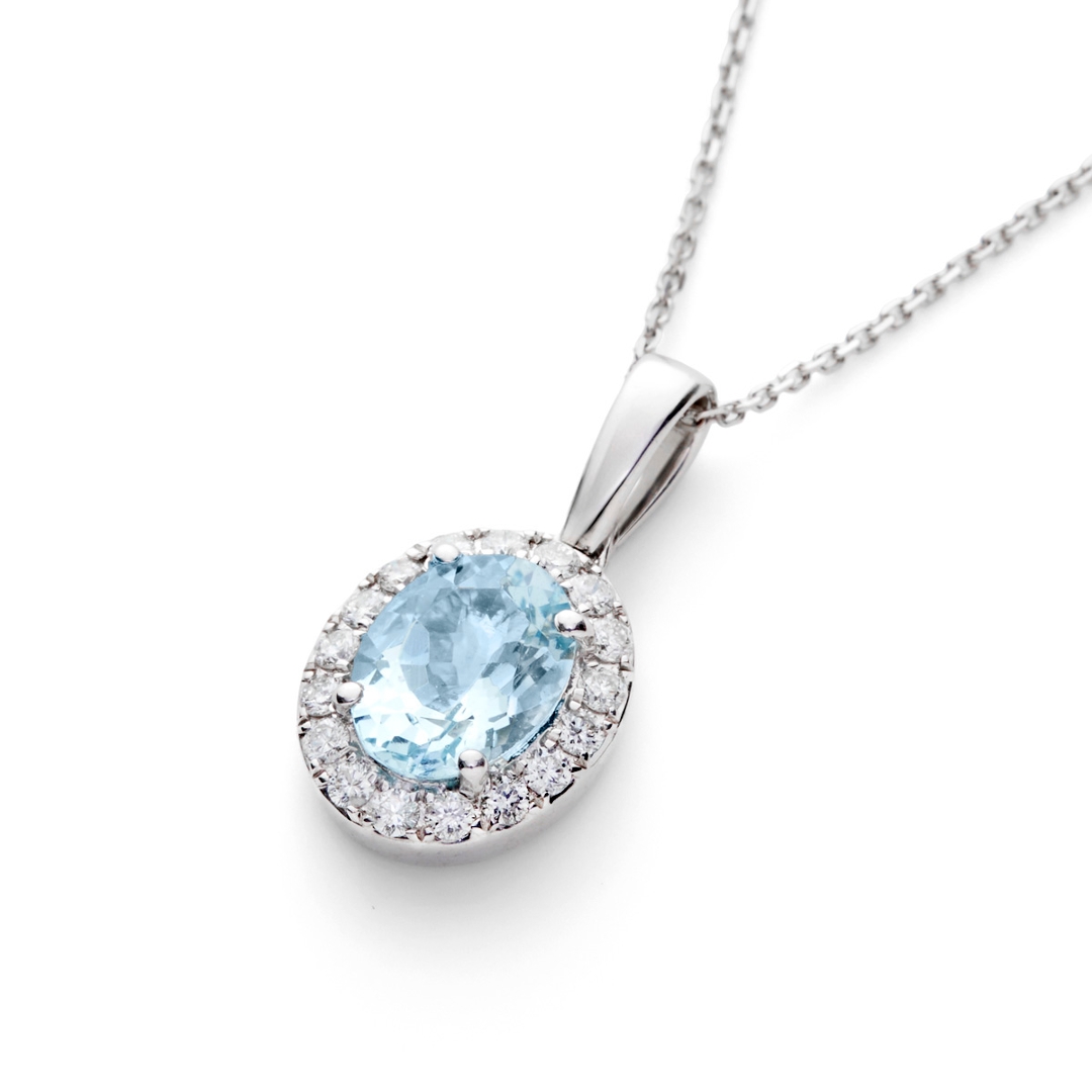 A brand-new, unused, certified natural diamond & aquamarine oval-shaped cluster pendant, with one oval mixed-cut aquamarine gemstone at the centre & a cluster of brilliant-cut diamonds in a halo setting, in 9ct white gold.