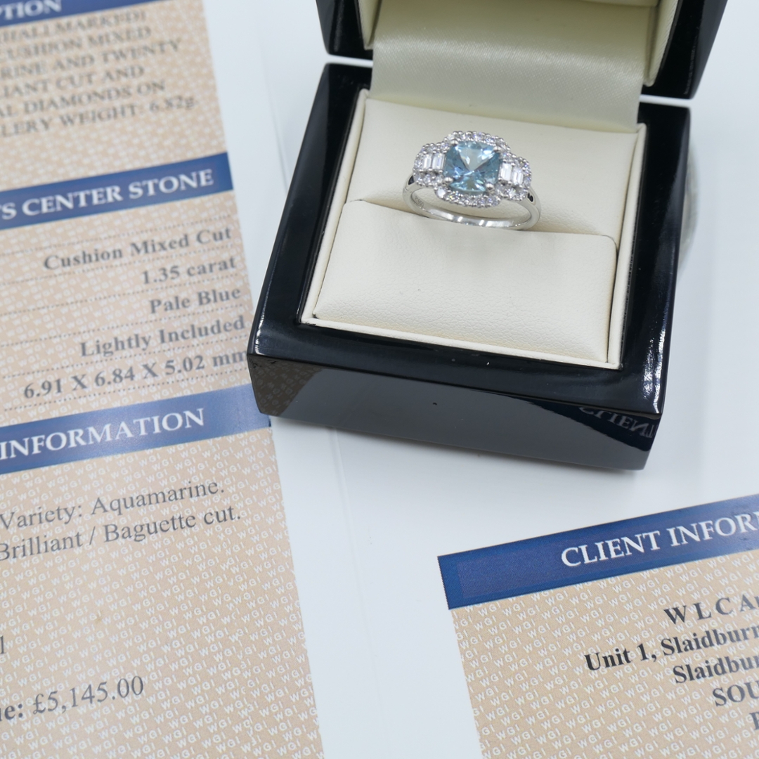 A brand-new, unused certified natural diamond and aquamarine cluster ring that exudes sophistication and timeless elegance. At its centre rests a 1.35-carat cushion step-cut aquamarine, displaying a delicate pale-blue hue with exceptional clarity and luminosity. Framing the central gemstone is a striking combination of baguette-cut and brilliant-cut natural diamonds, forming a radiant halo that extends along the shoulders, creating a captivating display of light and depth. The diamonds, totalling 0.55 carats, are graded G–H in colour and VS2–SI1 in clarity, offering superb brilliance that perfectly complements the aquamarine’s calm, ethereal tone.