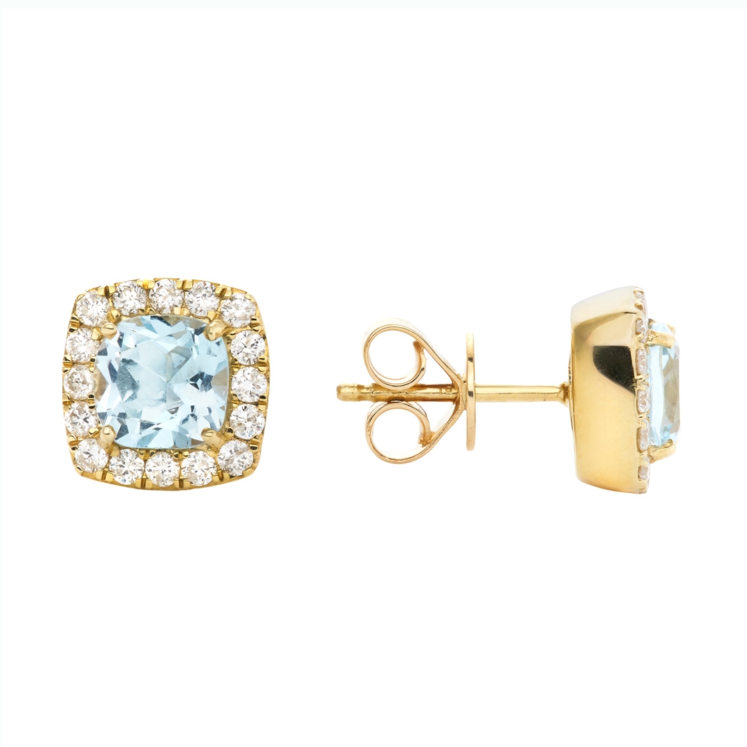 A brand-new, unused, certified pair of natural diamond & aquamarine gemstone cushion-shaped cluster earrings, with two cushion-mixed cut aquamarine gemstones & a cluster of brilliant cut diamonds, set in 18ct yellow gold.