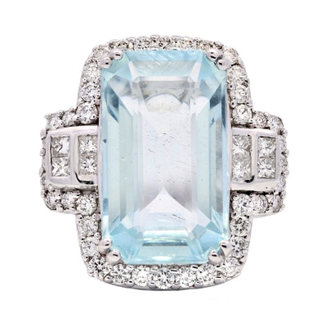 Surrounding the centre stone is a radiant halo of brilliant-cut natural diamonds, with additional diamonds set along the shoulders to enhance the ring's overall sparkle. These diamonds have a combined total weight of 0.65 ct, creating a bright frame that contrasts beautifully with the serene blue of the aquamarine. Natural diamonds are consistently appreciated for their remarkable durability, rarity and the timeless prestige they bring to fine jewellery, qualities that have ensured their continued desirability across generations.