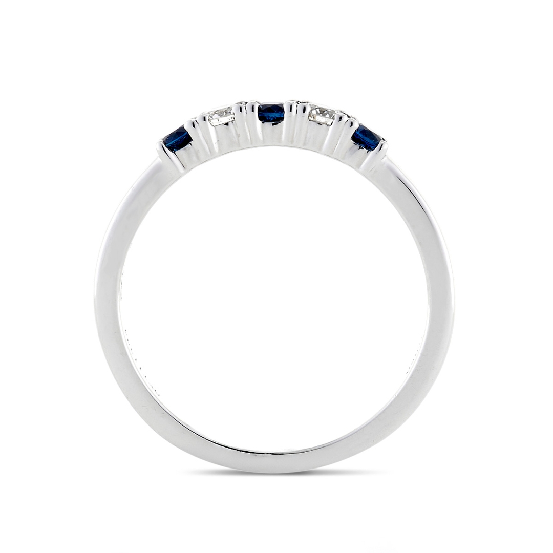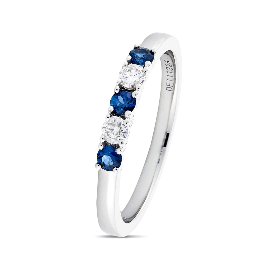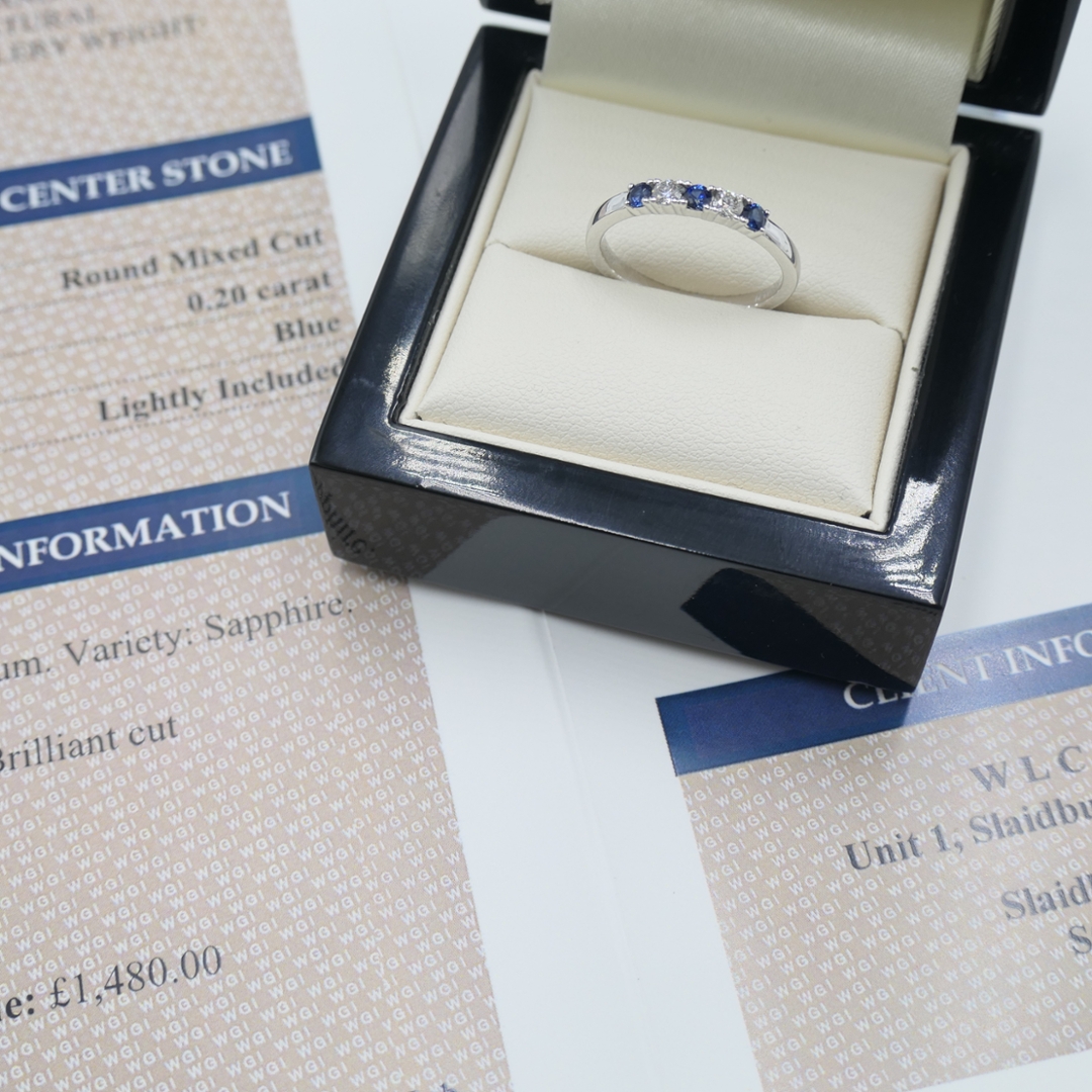 A brand new, unused, certified natural diamond & blue sapphire gemstone eternity ring, set with three round mixed cut blue sapphire gemstones & two brilliant cut diamonds, set in platinum.