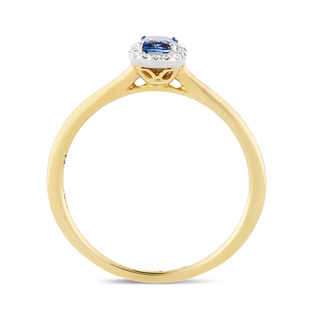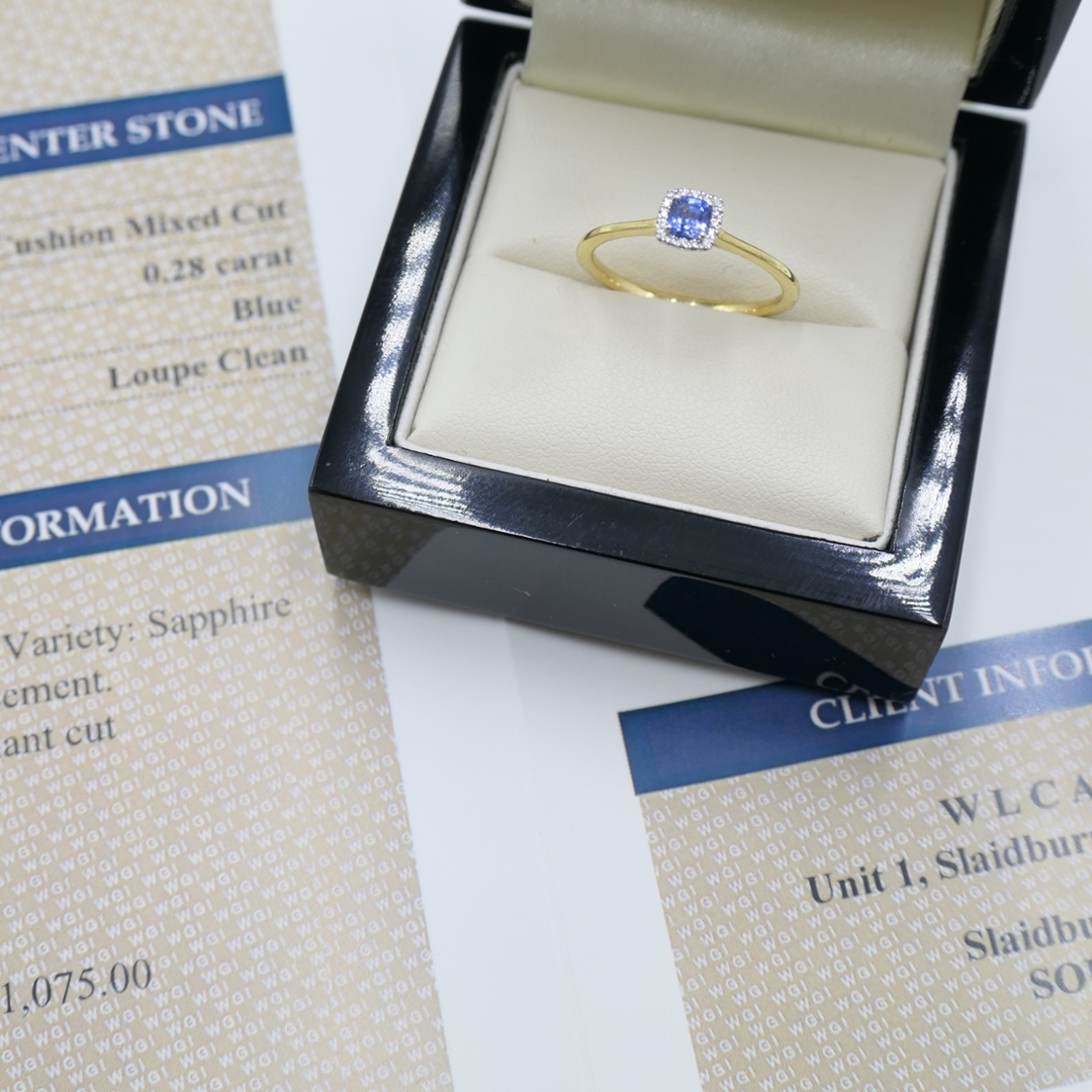 A brand-new, unused, certified 18ct yellow gold natural diamond and blue sapphire gemstone cushion-shaped cluster ring. At the heart of this stunning piece lies a cushion-cut blue sapphire weighing 0.28 carats, radiating a rich, captivating blue hue. Surrounding the sapphire is a halo of brilliant-cut diamonds, totalling 0.03 carats, which add a brilliant sparkle to the design. The diamonds, with SI1-SI2 clarity and G-H colour, enhance the ring's overall elegance.