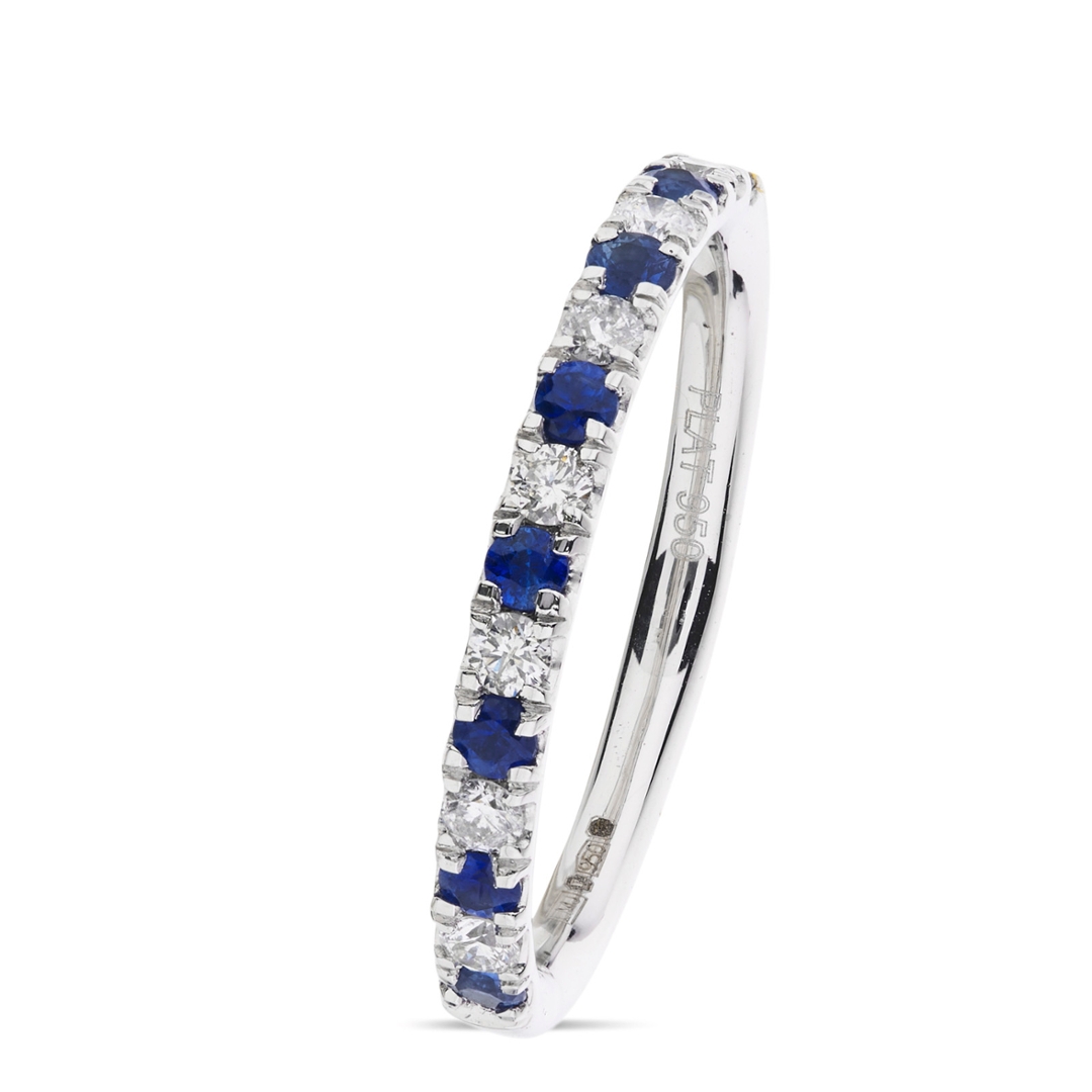 A brand-new, unused certified platinum eternity ring, exquisitely set with seven natural brilliant-cut diamonds, totalling 0.21ct, displaying clarity grades of SI1-SI2 and colour grades G-H. These sparkling diamonds alternate beautifully with eight round, mixed-cut, natural blue sapphires, weighing 0.33ct, creating an elegant harmony of rich colour and shimmering brilliance. Crafted in premium platinum, the ring expertly showcases the distinct allure and intrinsic beauty of natural gemstones and diamonds. 3.09 grams in weight.