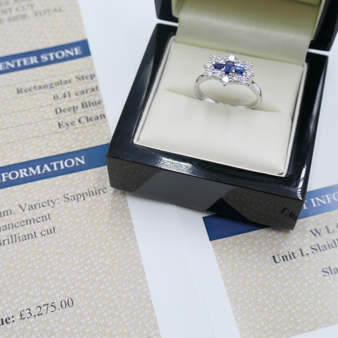 A brand new, unused, certified platinum natural diamond and blue sapphire gemstone boat-shaped cluster ring. This striking design features three rectangular step-cut blue sapphires, each weighing 0.13 carats, set in the centre. Their deep blue hue provides a rich, elegant focal point, exuding a sense of sophistication and timeless appeal. Surrounding the sapphires is a halo of brilliant-cut diamonds, totalling 0.56 carats, which add exceptional sparkle and complement the sapphires' vibrant blue. The diamonds, with clarity grades of SI1-SI2 and colour range of F-G, offer brilliant clarity and a radiant shine.