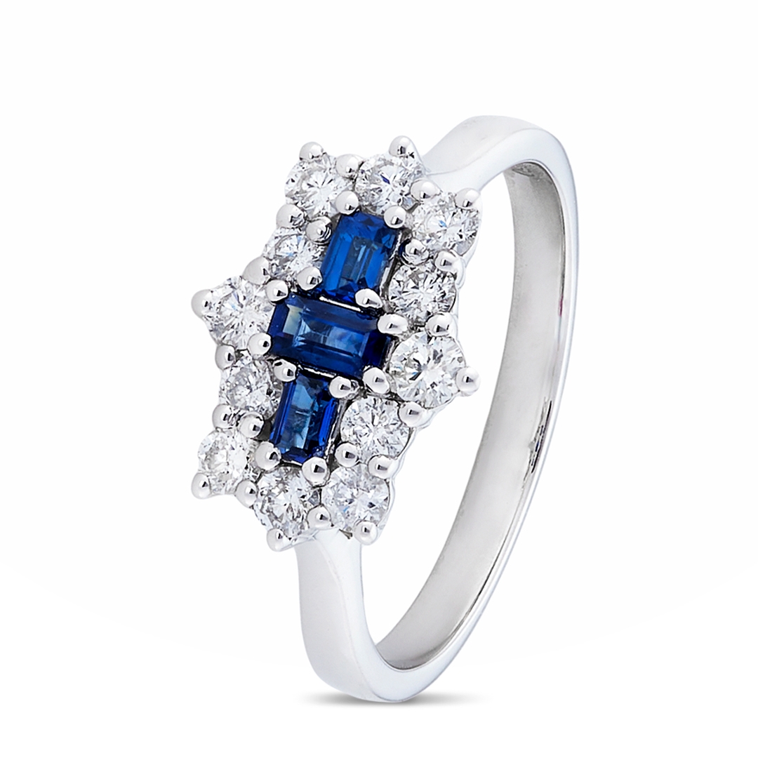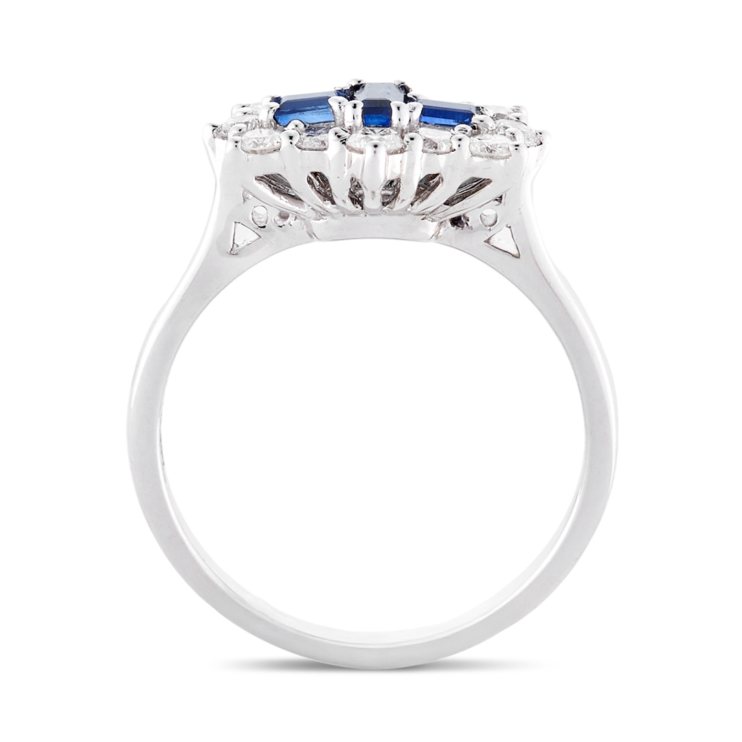 A brand new, unused, certified natural diamond & blue sapphire gemstone boat-shaped cluster ring, set with three rectangular step-cut blue sapphire gemstones to the centre & a cluster of brilliant-cut diamonds in a halo setting, set in platinum.