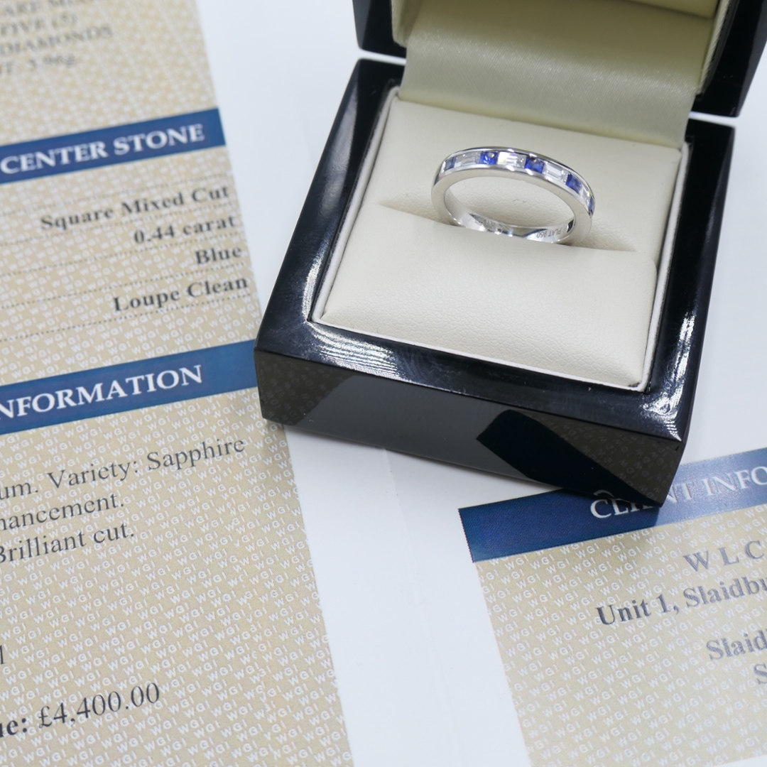 A brand-new, unused certified platinum eternity ring, expertly set with six captivating square mixed-cut natural blue sapphires weighing a total of 0.44ct, elegantly alternated with five dazzling natural baguette-cut diamonds totalling 0.60ct. Each diamond exhibits superb clarity, graded between VS2 and SI1, and an appealing colour range of G-H, ensuring exceptional sparkle and sophisticated brilliance. Crafted from premium platinum and weighing 5.96 grams, this exquisite ring showcases the unmatched beauty and rarity of genuine gemstones.