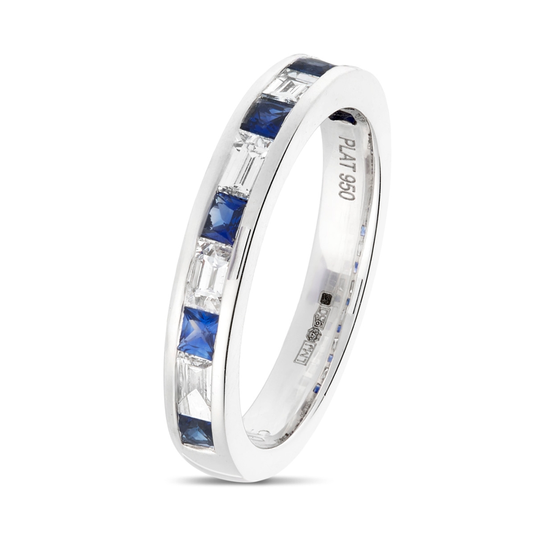 A brand new, unused, certified natural diamond & blue sapphire gemstone eternity ring, set with six square mixed-cut blue sapphire gemstones & five baguette-cut diamonds, set in platinum.