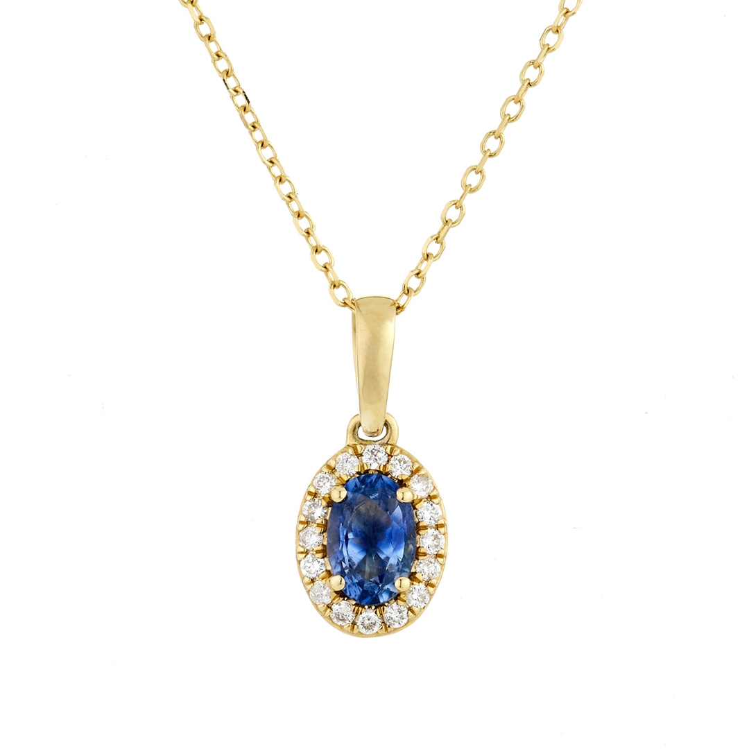 A brand-new, unused, certified natural diamond & blue sapphire oval-shaped cluster pendant, with one oval mixed-cut blue sapphire gemstone at the centre & a cluster of brilliant-cut diamonds in a halo setting, in 18ct yellow gold.
