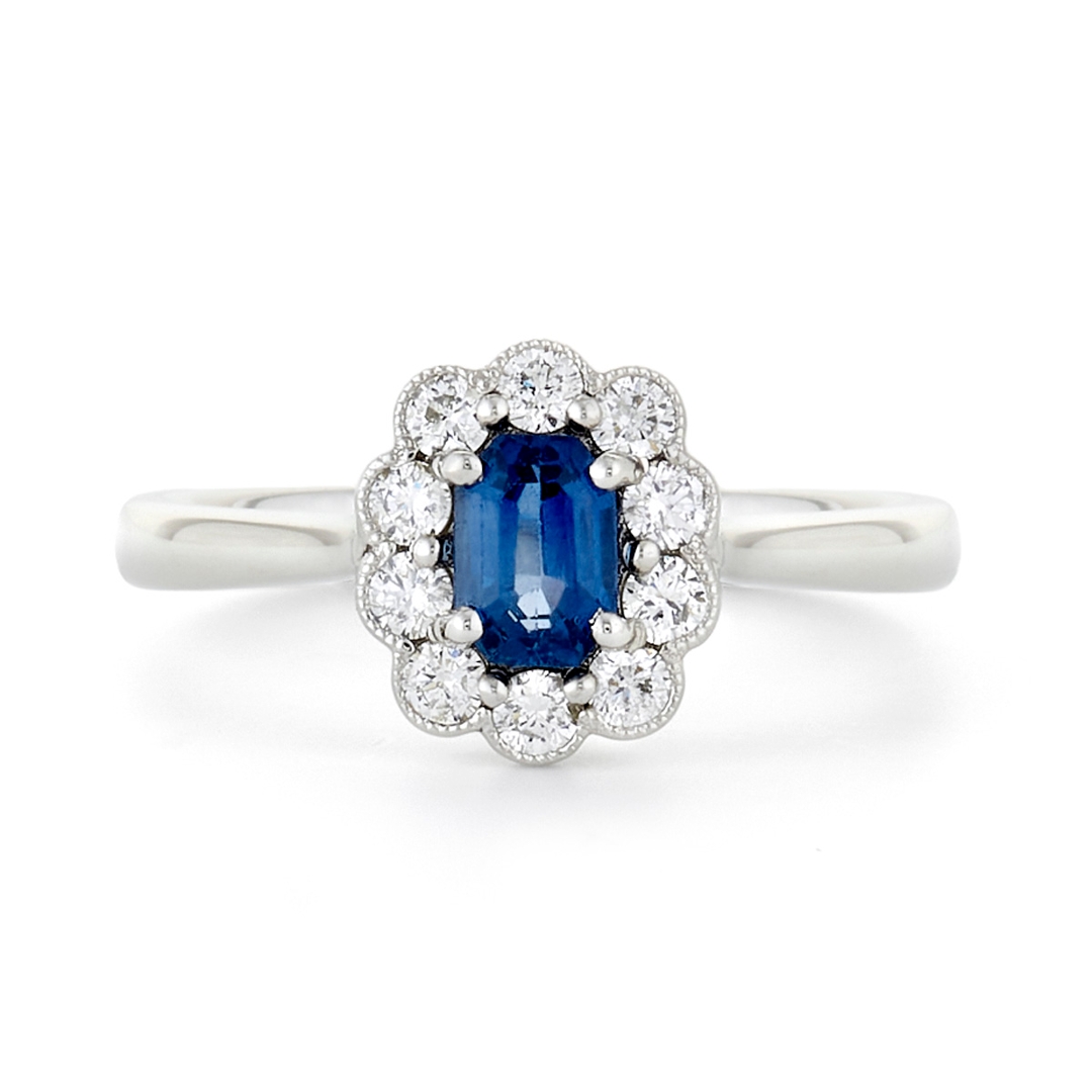 A brand-new, unused, certified natural diamond & blue sapphire flower-shaped cluster ring, set with one octagonal step-cut blue sapphire at the centre & a cluster of brilliant-cut diamonds in a halo setting, set in platinum.