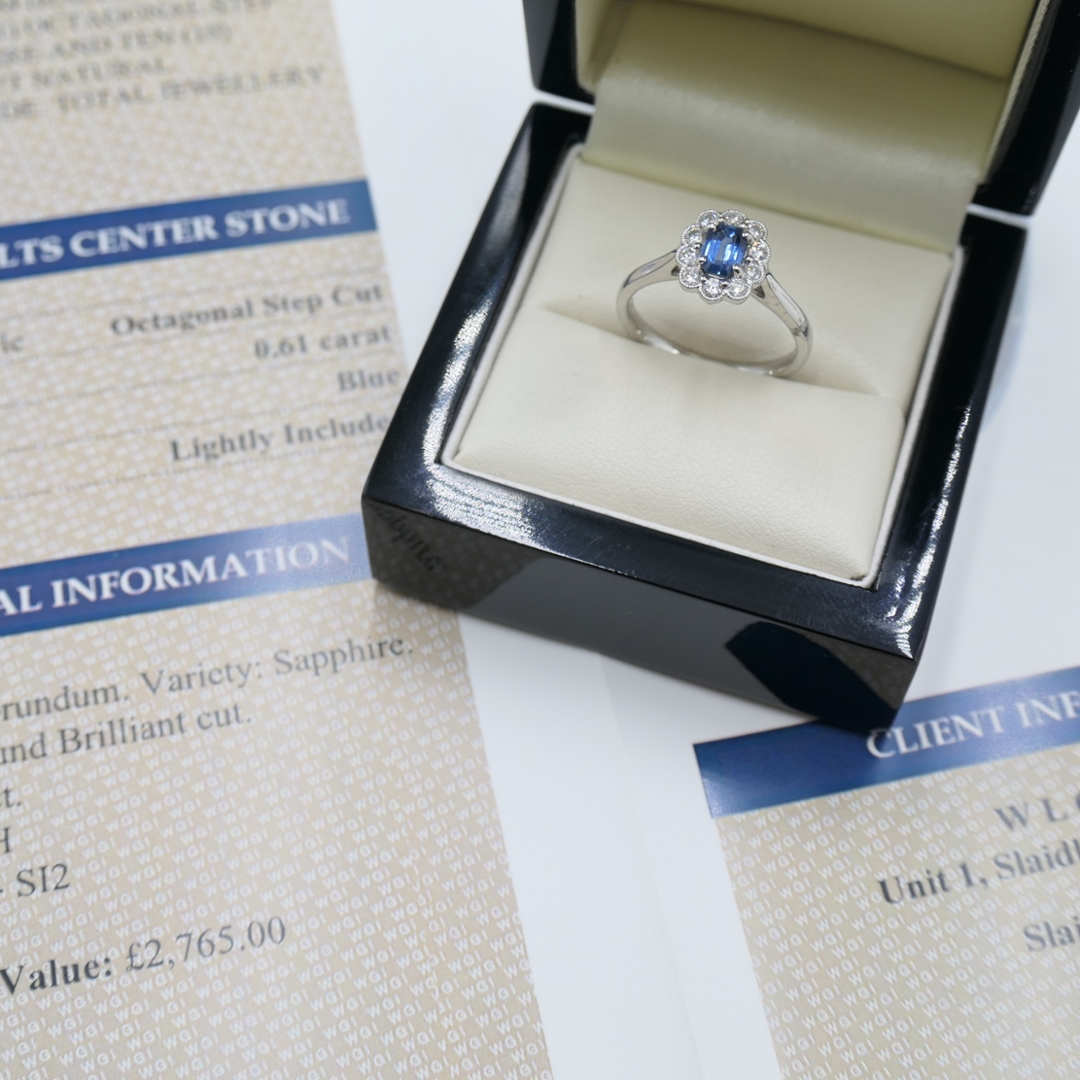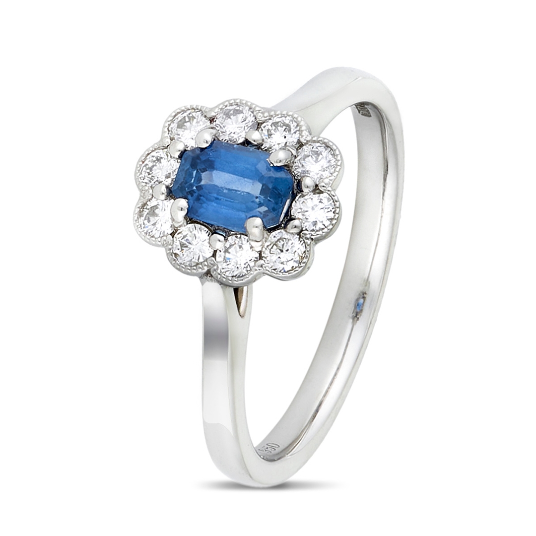 A brand-new, unused, certified-platinum, natural-diamond and blue-sapphire, flower-shaped cluster ring, this elegant piece exudes classic sophistication with a modern edge. At the centre lies a striking 0.61ct octagonal step-cut blue sapphire, showcasing a vivid, velvety hue that symbolises wisdom, loyalty, and timeless beauty. The clean, geometric lines of the sapphire are perfectly complemented by a halo of brilliant-cut natural diamonds arranged in a graceful flower-shaped cluster, creating a look that is both refined and eye-catching.