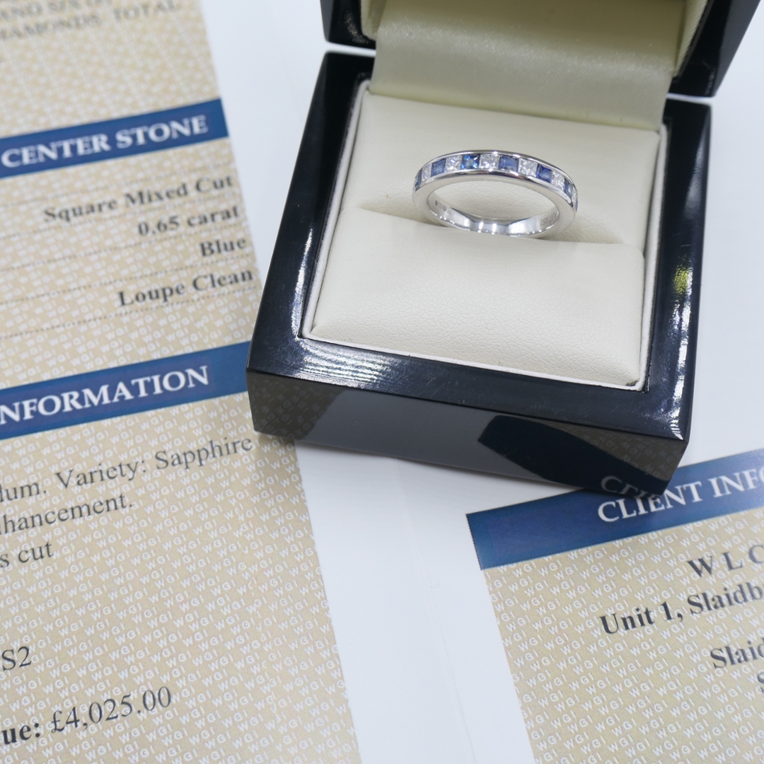 A brand-new, unused certified platinum eternity ring, gracefully set with seven vibrant square mixed-cut natural blue sapphires totalling 0.65ct, beautifully complemented by six princess-cut natural diamonds weighing 0.50ct. These diamonds feature exceptional VS1-VS2 clarity and a desirable colour range of G-H, perfectly accentuating the sapphires' deep blue tones. Meticulously crafted in platinum, this elegant piece captures the unique charm, brilliance, and enduring appeal exclusive to authentic natural gemstones.