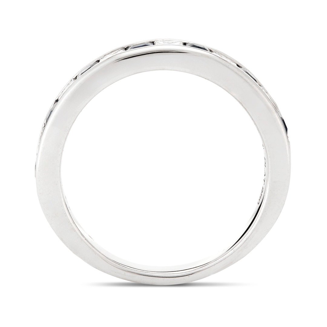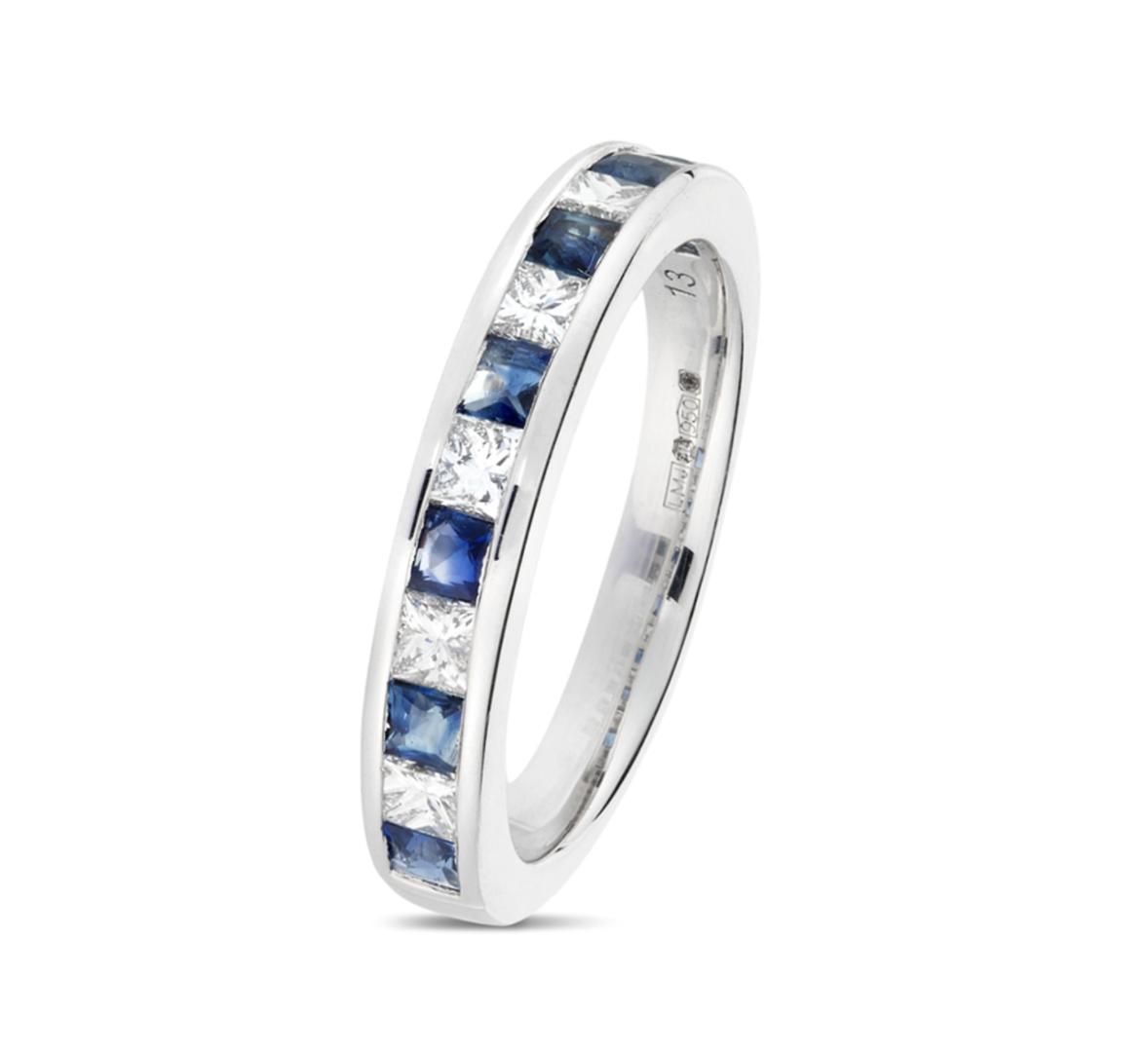A brand new, unused, certified natural diamond & blue sapphire gemstone eternity ring, set with seven square mixed cut blue sapphire gemstones & six princess cut diamonds, set in platinum.