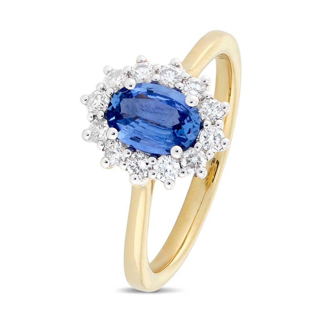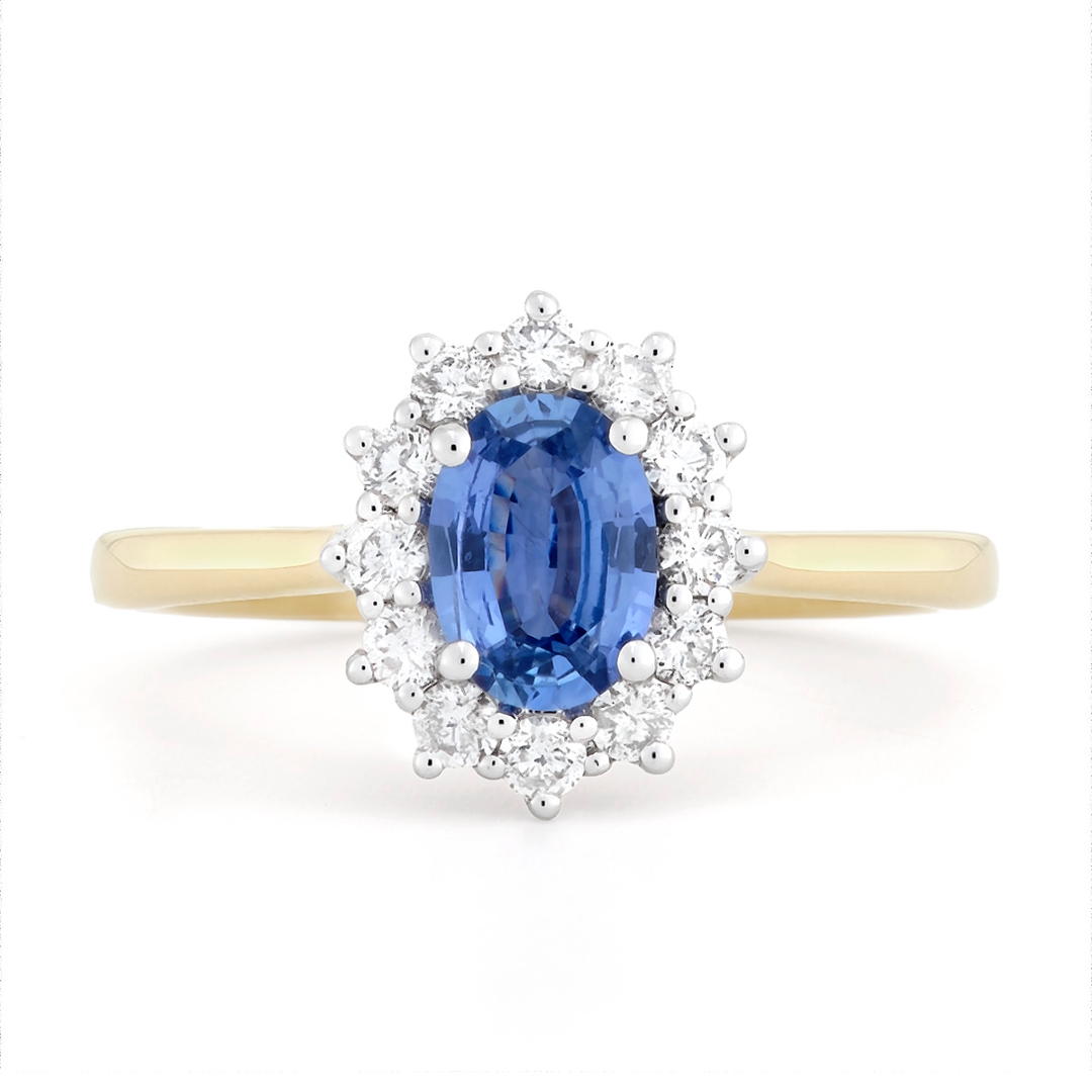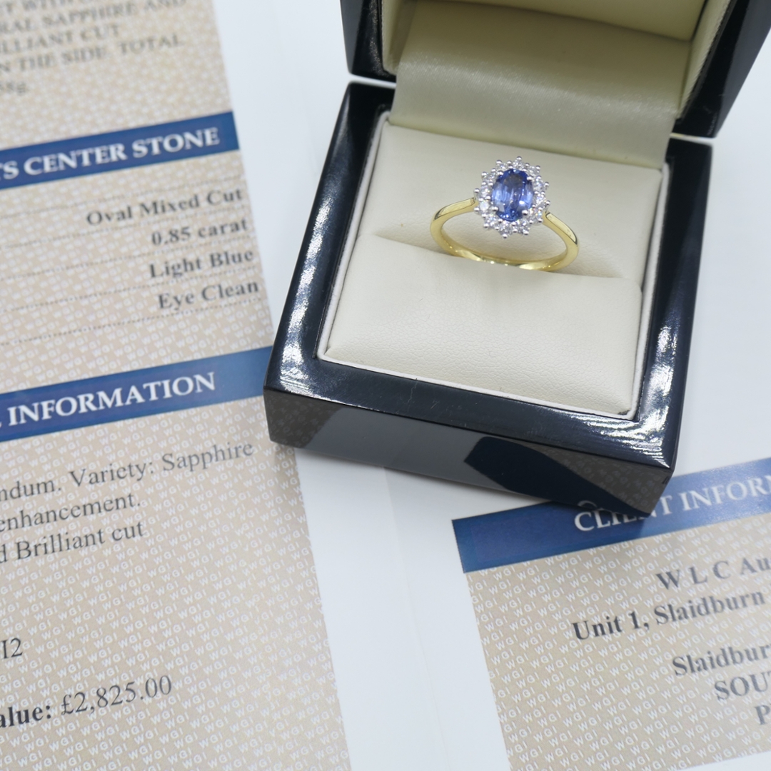 A brand-new, unused, certified natural diamond & blue sapphire gemstone cluster ring, set with one oval mixed-cut blue sapphire gemstone at the centre & a cluster of brilliant-cut diamonds in a halo setting, set in 18ct yellow & white gold.