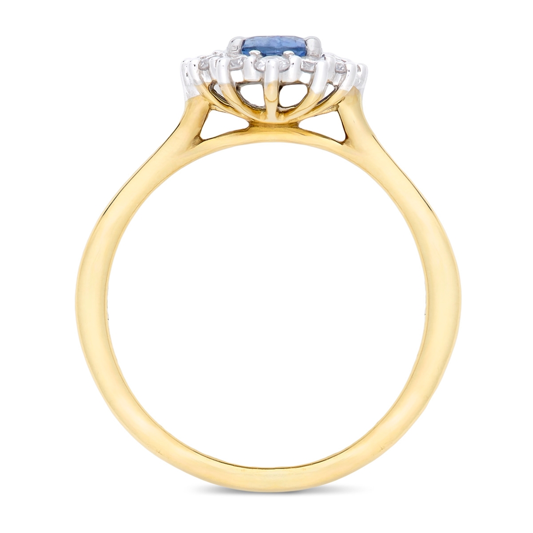 A brand-new, unused, certified 18ct yellow and white gold natural diamond and blue sapphire gemstone cluster ring, this elegant piece features a 0.85ct oval mixed-cut blue sapphire at its centre, radiating a soft, light blue hue that captures attention with its subtle beauty. Surrounding the sapphire is a dazzling halo of brilliant-cut diamonds, totalling 0.35ct. These diamonds, graded SI1-SI2 for clarity and G-H for colour, offer exceptional brilliance, enhancing the sapphire's serene colour and adding an extra layer of sparkle to the design.