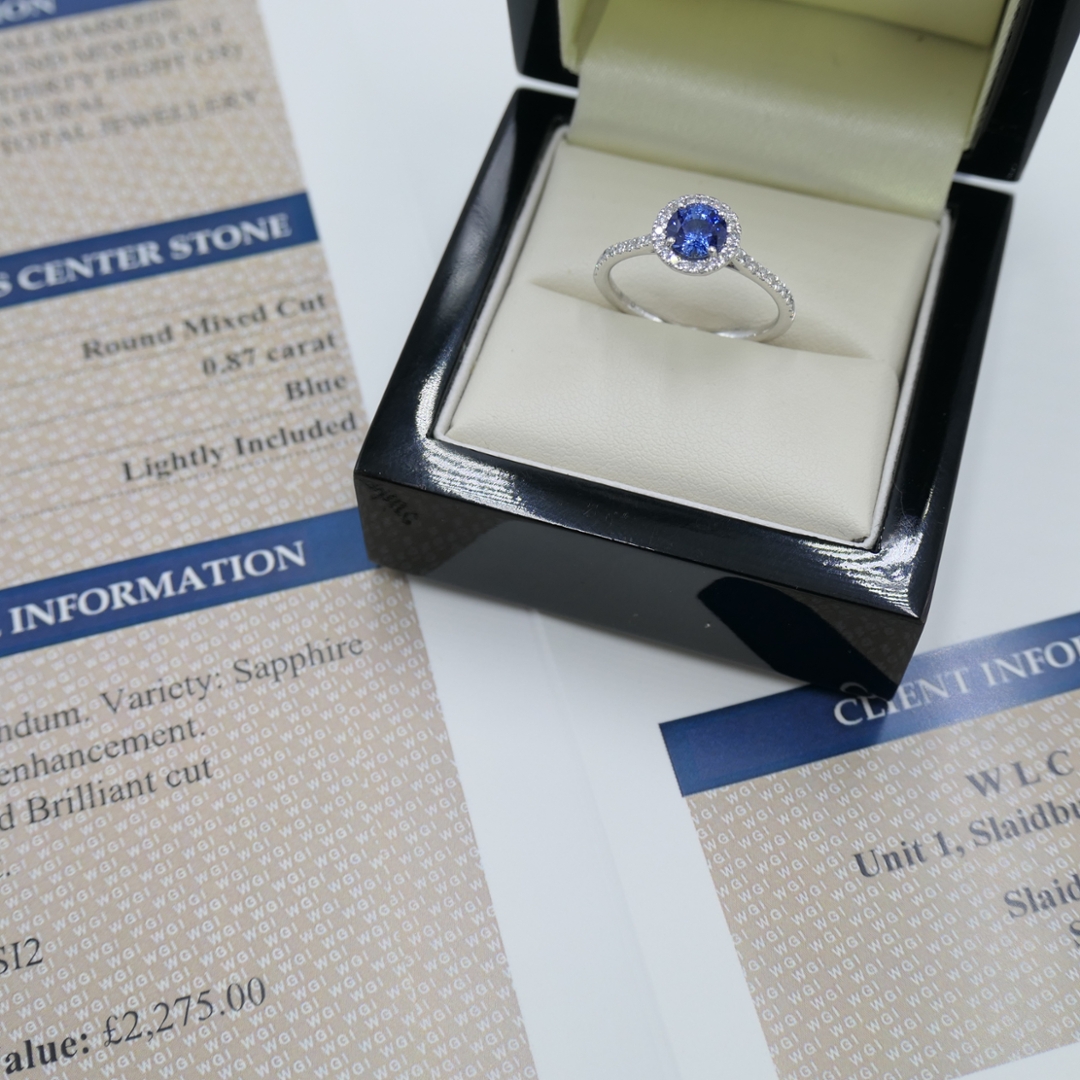A brand-new, unused certified natural diamond and blue sapphire cluster ring that radiates elegance, luxury and timeless appeal. At its centre lies a captivating 0.87ct round, mixed-cut blue sapphire, displaying a deep, enchanting hue that symbolises wisdom, truth and serenity. Surrounding the sapphire is a halo of brilliant-cut natural diamonds, with additional diamonds adorning the shoulders, totalling 0.26ct. The diamonds, graded G–H in colour and SI1–SI2 in clarity, create a dazzling contrast that enhances the sapphire’s rich tone. Expertly crafted in platinum, a metal celebrated for its strength, purity and enduring lustre, this ring exemplifies fine craftsmanship and refined sophistication. With a total weight of 3.48 grams and a professional valuation of £2,275, it is a true statement of quality and style.