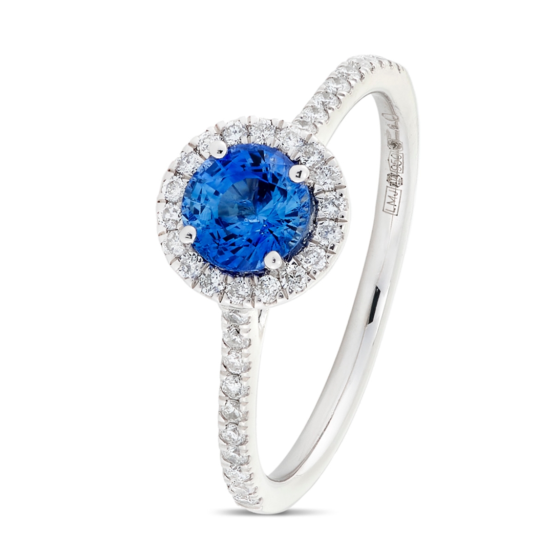 A brand new, unused, certified natural diamond & blue sapphire gemstone round-shaped cluster ring, set with one round mixed cut blue sapphire gemstone to the centre & a cluster of brilliant cut diamonds in a halo setting & to the shoulders, set in platinum.